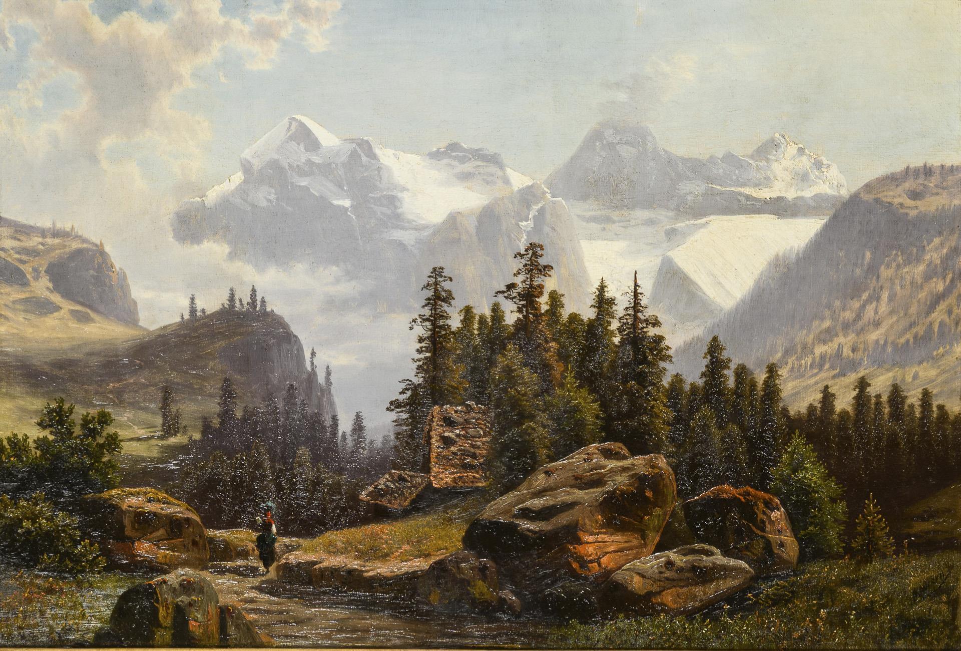 Staffage figure on a path between large rocks near the house with a view over the fir trees to the snow-covered peaks behind the valley. Two small restored areas with backing.