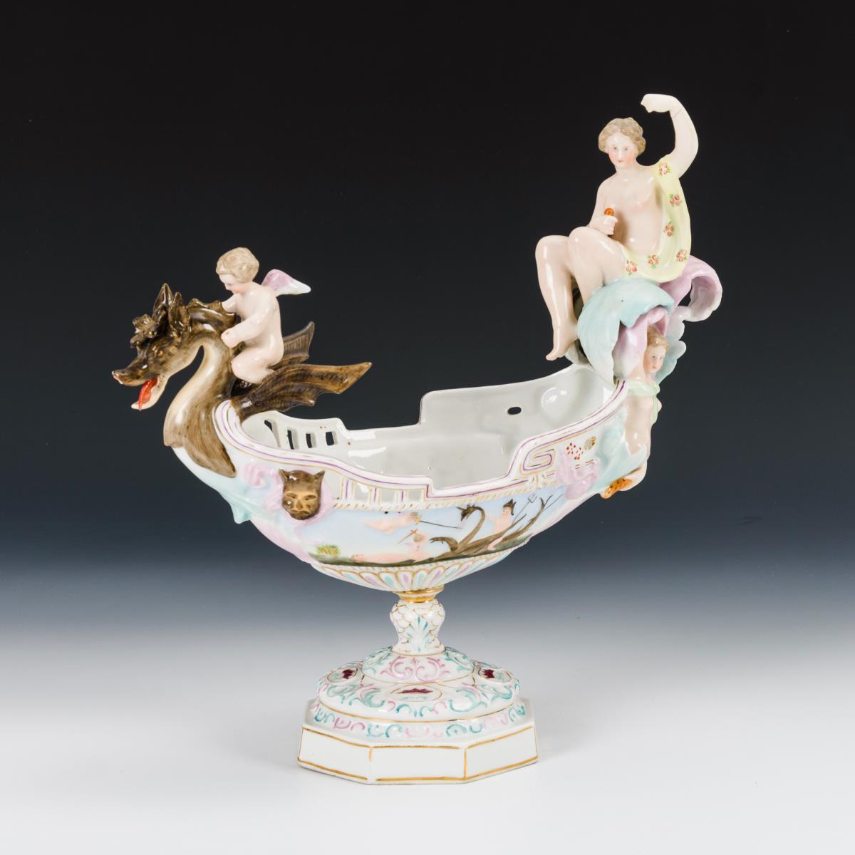 1 Hand der Venus geklebt, Drachenflügel und Zunge restauriert, 1 Zungenspitze fehlt.