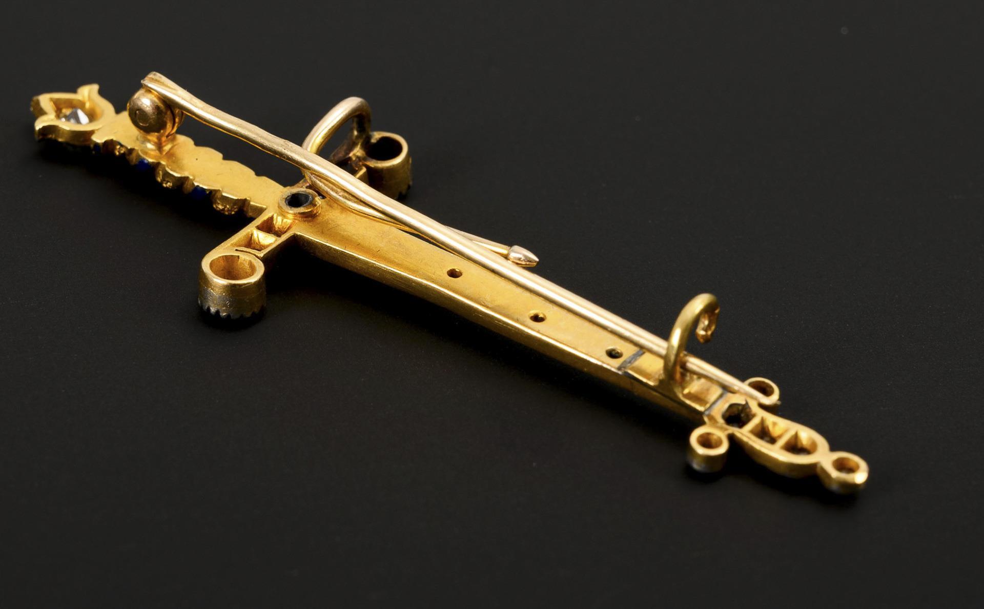 Exceptional historical brooch with blue enameling and old-cut diamonds and brilliant-cut diamonds, the pin with single hook clasp and additional hook on the back. Slight signs of wear commensurate with age; the enamel with a minimal chip, the hook of the brooch restored, the pin slightly bent.
