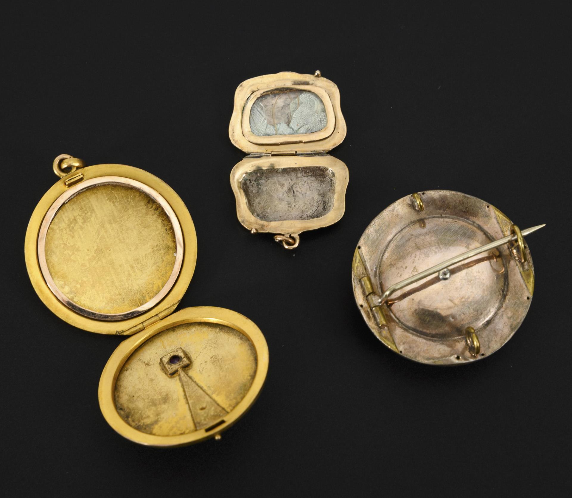 A round medallion with 3 seed pearls and pink stone, a small, purse-shaped medallion and a somewhat older round brooch with blue stone. Traces of wear consistent with age; inner frame of the larger medallion without glass inlay, only one side of the smaller medallion with frame and glass preserved, brooch hook and pin renewed.