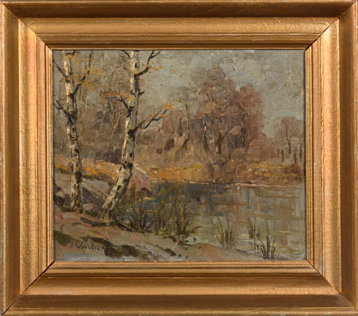 Andok, Ludwig von: Herbstliches Seeufer. Öl/Sperrholz, links unten signiert.