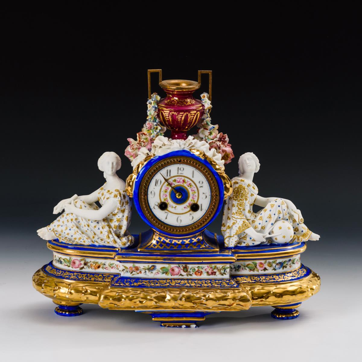 Ende 19. Jh. Werknummer: 783. Werk mit Halbstundenschlag auf Glocke. Herstellerprägung Werk: Ungemarkt. Weißes Emailzifferblatt mit arabischen Zahlen, Minuterie und Romaines-Zeiger. 31,5 x 36 x 14,5 cm. Porzellan, farb- und goldstaffiert. Blumenstaffierter Sockel im Louis Seize-Stil mit weiblichen Allegorien der Freien Künste. Werk läuft an. Stundenzeiger fehlt, Vase geklebt, berieben, partiell bestoßen. Ohne Pendel, ohne Schlüssel..
