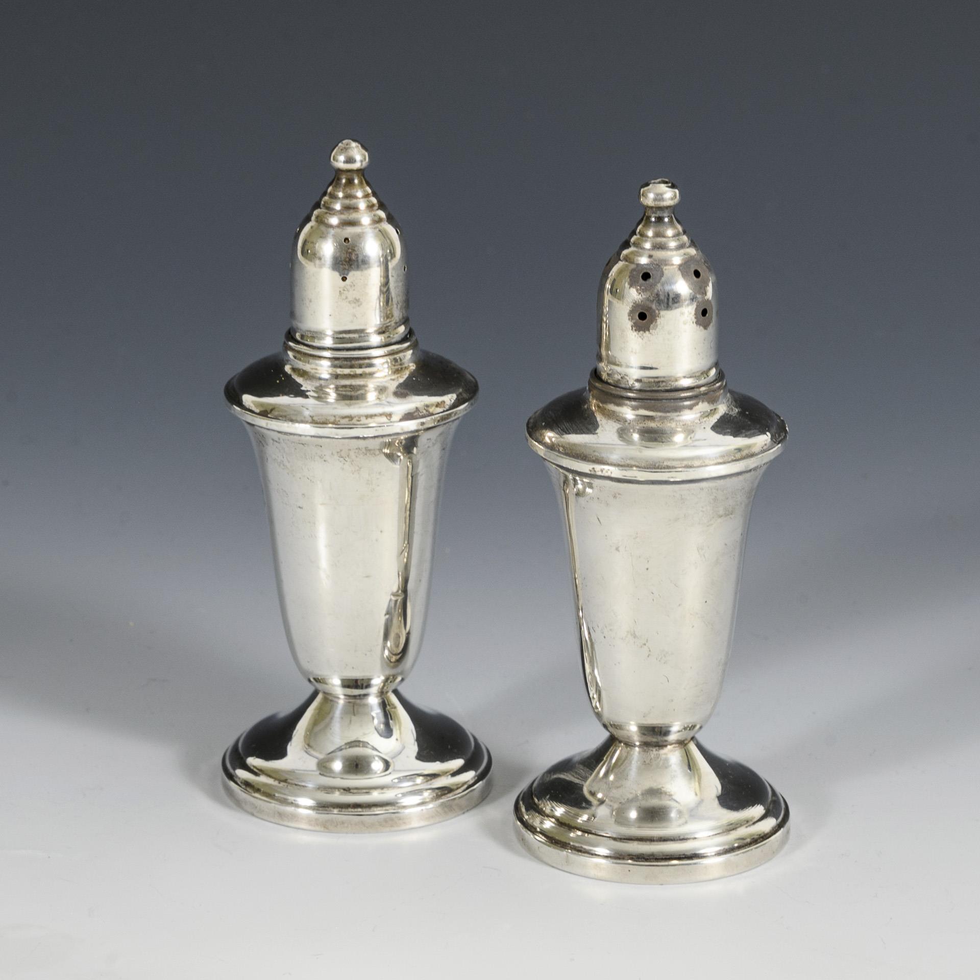 Salt and pepper shaker in baluster form, on weighted round foot. Signs of wear, dents.