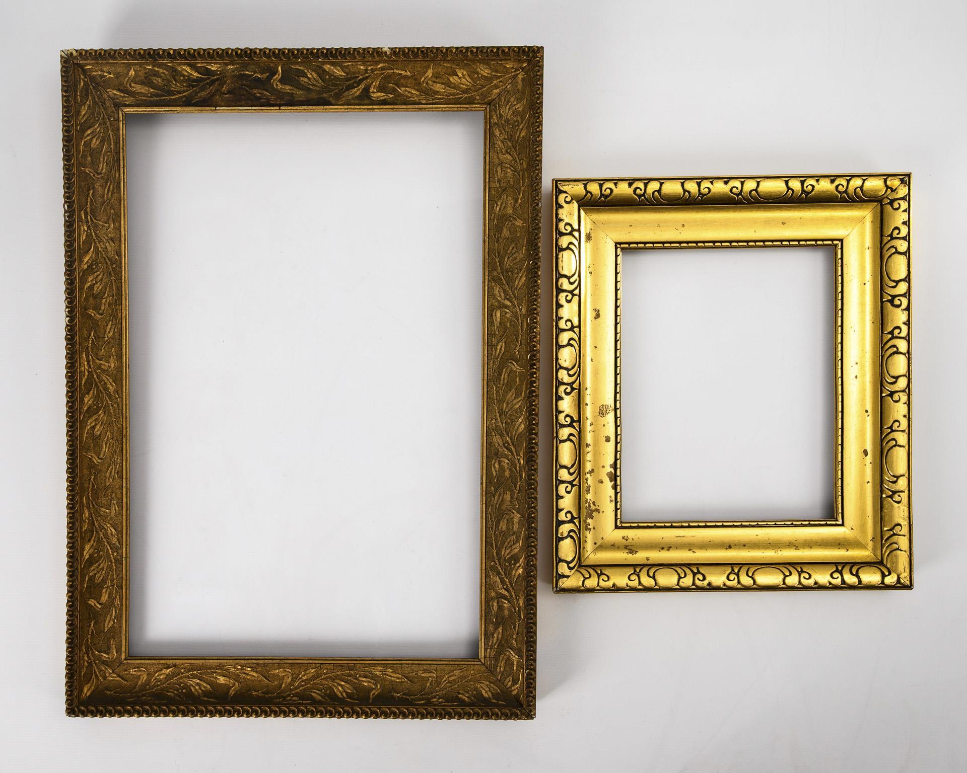 Wood, stucco, gilded or gold-bronzed. Clear dimensions 58 x 37.5 and 22.5 x 29 cm, rebated dimensions 60 x 40 and 25 x 31 cm, outer dimensions 70 x 50 and 38 x 44 cm. Total weight 3.2 kg.