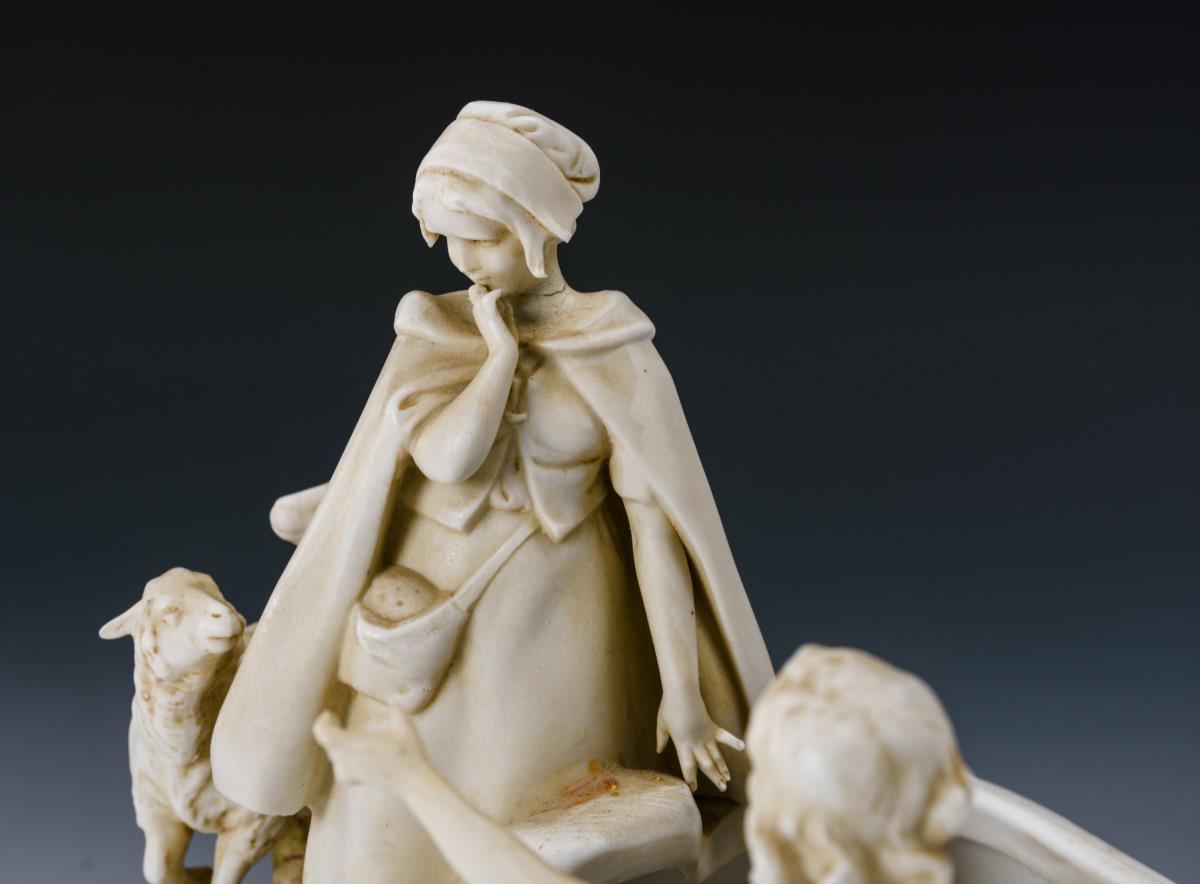 Linke Hand des Knaben, Hals des Mädchens und partiell Blüten restauriert, Kopf des Mädchens geklebt.