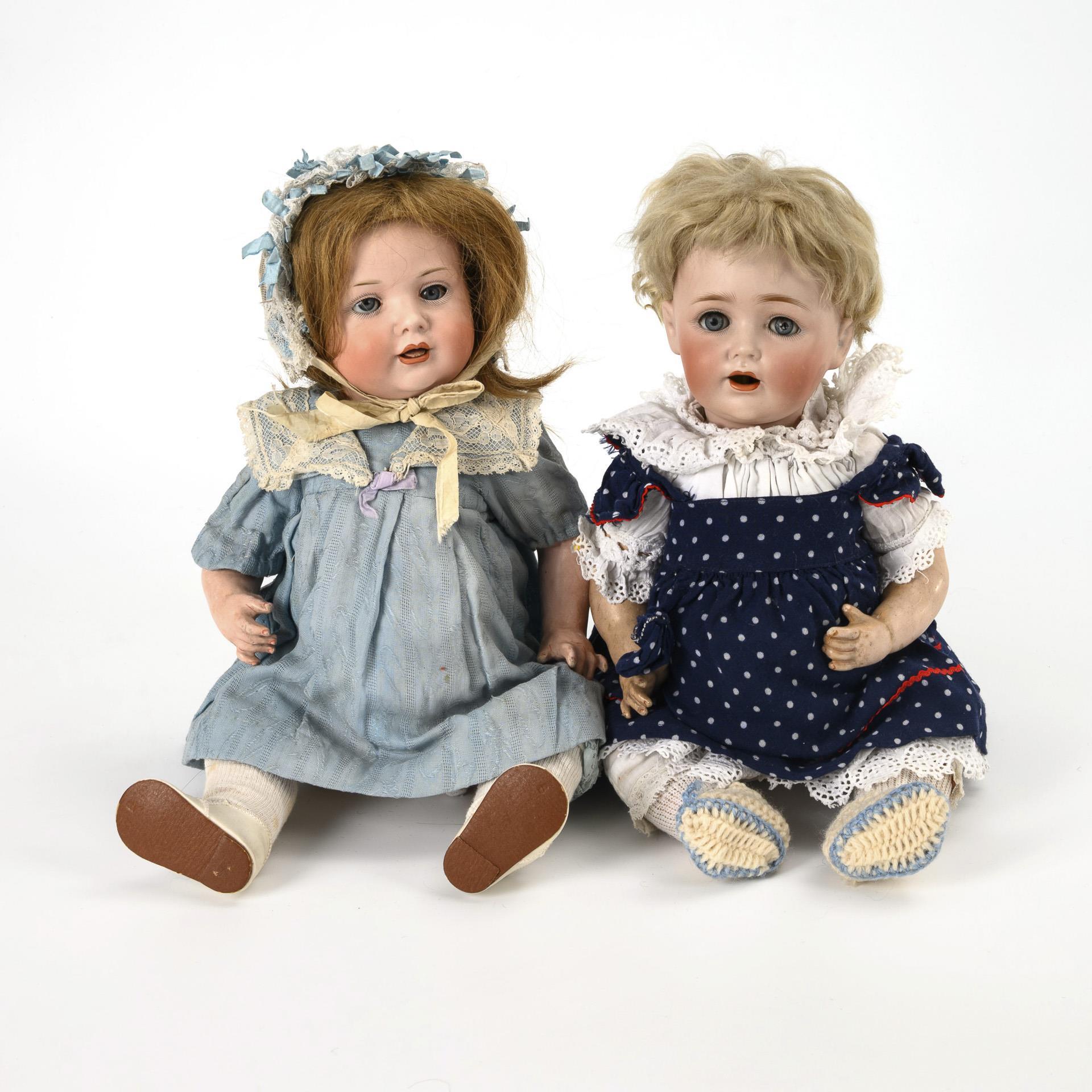 Both with cranked head, blue sleeping eyes, wig and 5-part sitting baby body. Kestner baby (JDK 257) with blond mohair wig and dark blue dress with white dots. Tongue missing. / Doll girl Baehr & Proeschild (585) with red-blonde real hair wig and light blue dress, 1 leg with retouched tear. Wigs firm, heads not x-rayed: no defects visible.