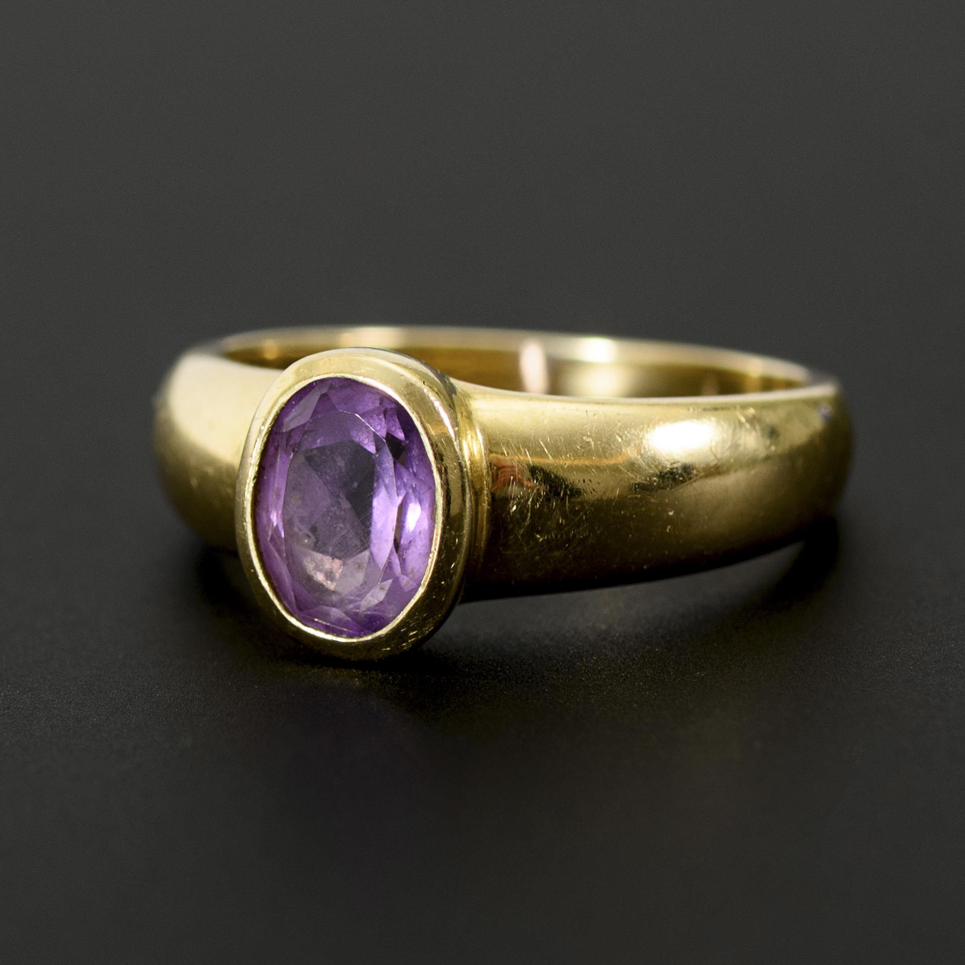 Broad ring with oval-cut violet colored stone, probably rhodochrosite.
