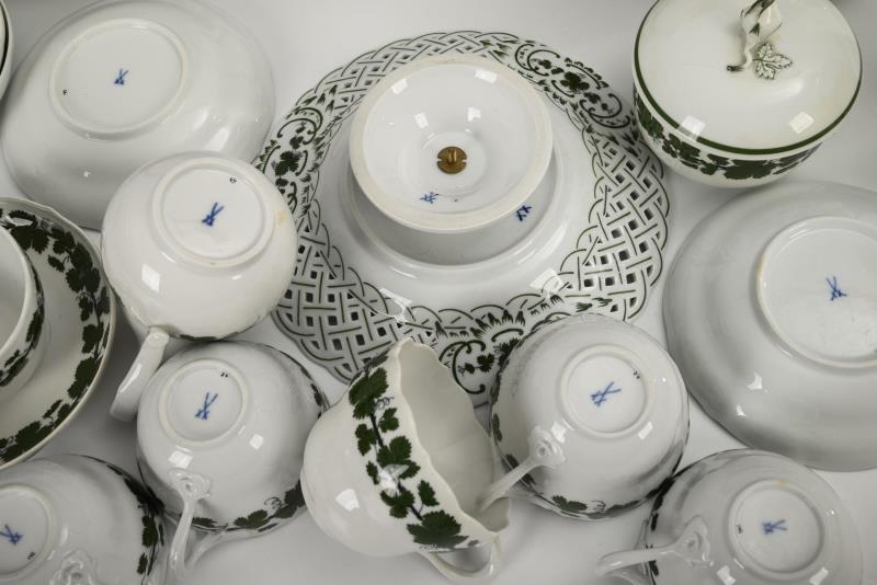 24 pieces. "New cut-out" shape. Coffee pot (H 23.5 cm), milk jug, sugar bowl, 6 cups, 6 saucers, 6 cake plates, 1 krater vase (H 14 cm), 1 centerpiece (H 5.5 cm) and 1 cake plate (Ø 34.5 cm). Chip on 1 saucer rim.