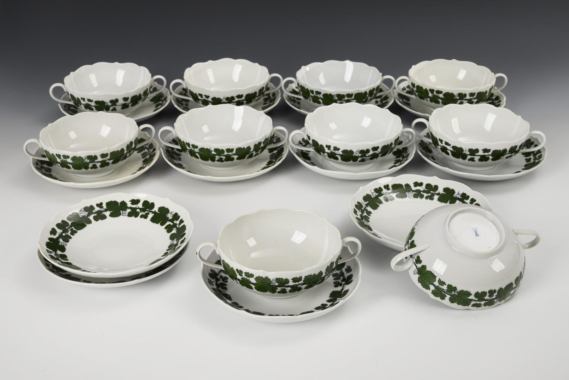 Underglaze green painting. 10 soup cups (Ø 17.5 cm), 12 saucers (Ø 17 cm). 5.3 kg.