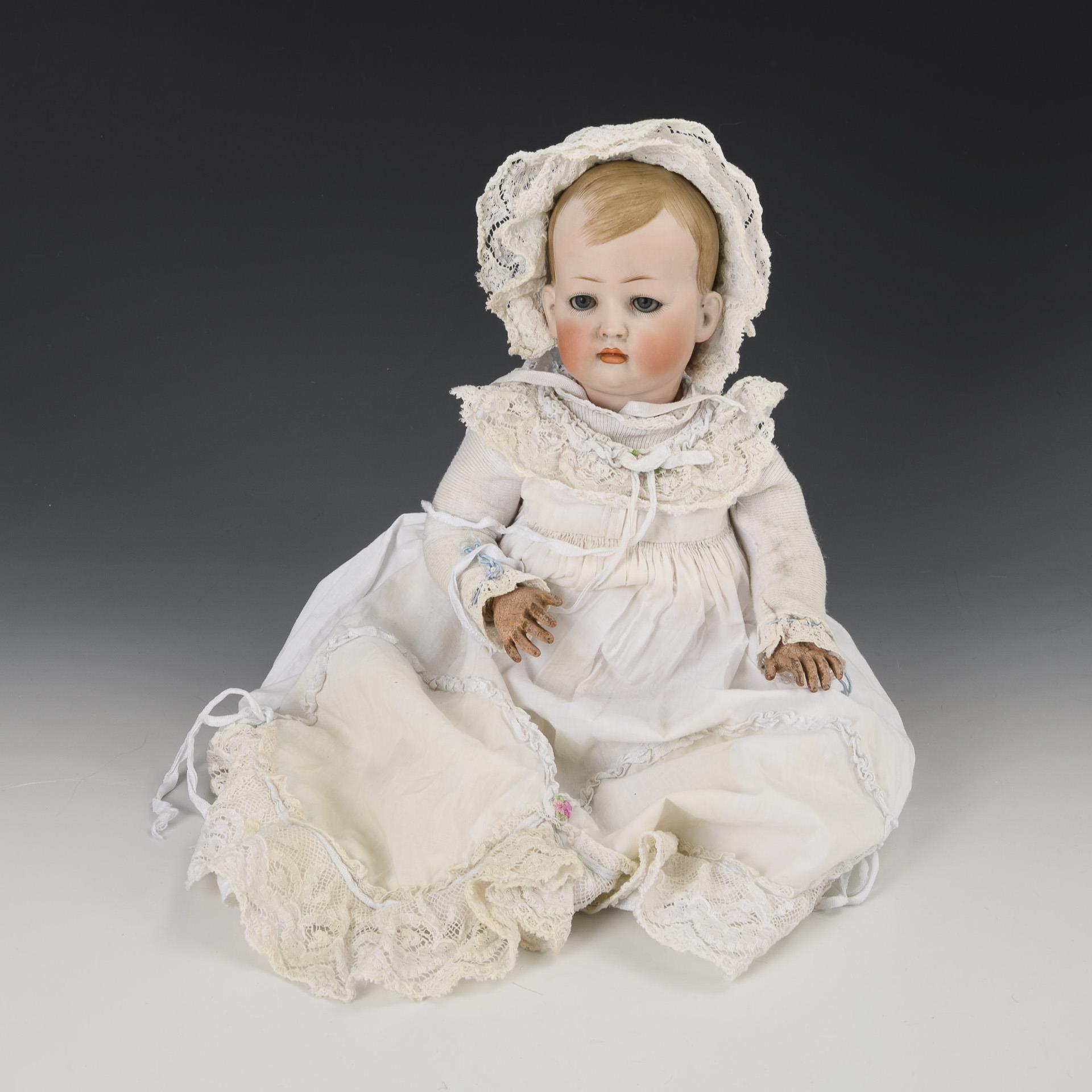 Full head, blue sleeping eyes, open/closed mouth, lightly modeled and painted brown hair. 7-part sitting baby body with crackled rubber hands. White clothing. Small chips to the neck crank, body with signs of age and defects.