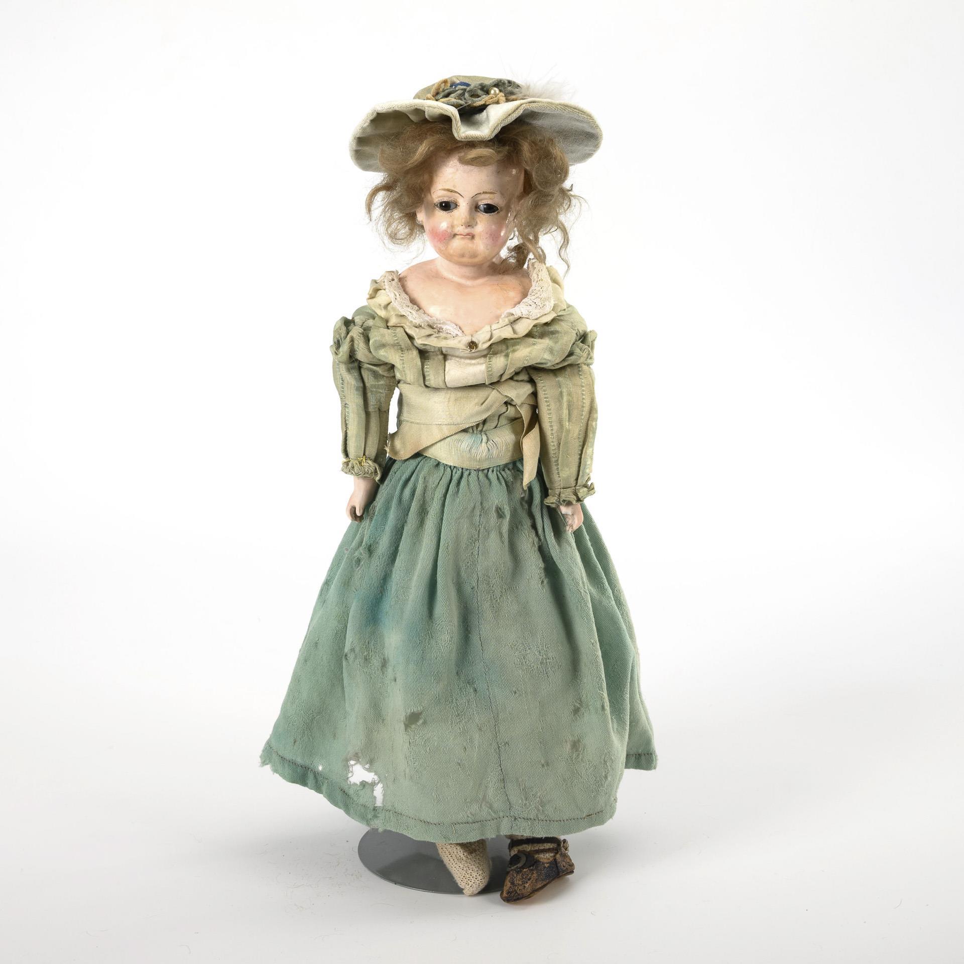 Papier-mâché chest head, brown glass eyes, mohair wig. Leather body with bisque forearms, legs with butt and knee gussets. Head with retouches. Body and dress with traces of age, left hand defective, 1 shoe missing.