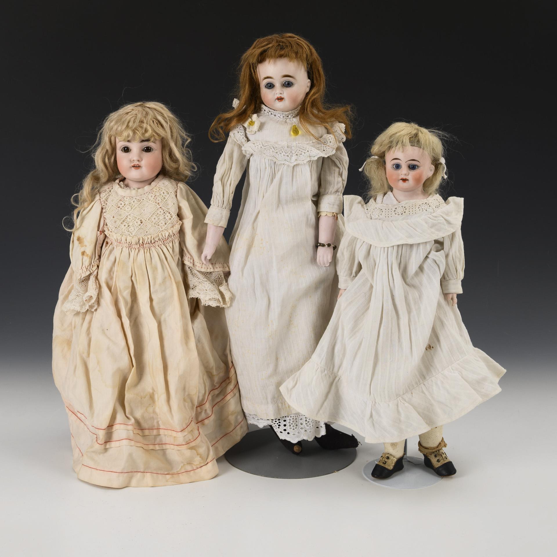 All with chest head, sleeping eyes, defective blond wig and bisque arms. 1 head with glued tear to the back sheet, 1x chip to the eye cut-out. Body with strong traces of age (partly trickling).