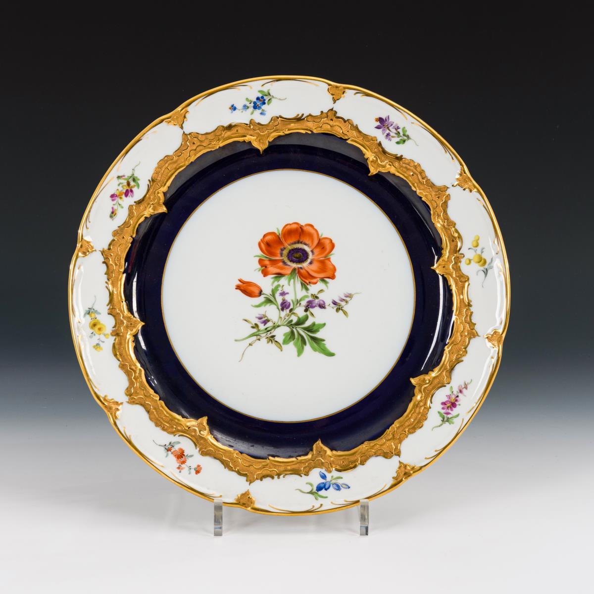 Kobaltblauer Teilfond, polychrome Blumenmalerei, teils bronzierte Goldstaffage.