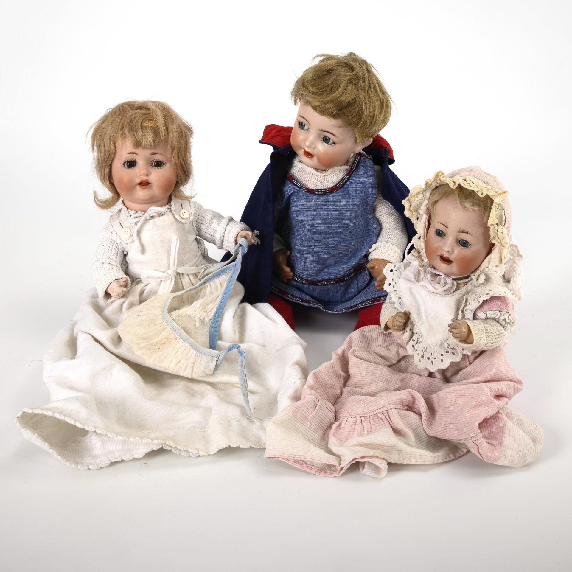 All with crank head, open mouth, blond mohair wig and 5-part sitting baby body. "Butterfly Baby" (F & W Goebel, for Max Handwerk, Bebe Elite, B 90/185) with white dress. Minimal wig pull on the forehead, fingers bumped. L 27 cm. / Character baby Hertel, Schwab & Co, for König & Wernicke (Germany 99) with pink dress and hood, l 24 cm. / "My favorite baby" (K & R 126) with blue sleeping eyes and blue apron. Small chip on the neck crank, arms painted over. L 35 cm. With small defects.