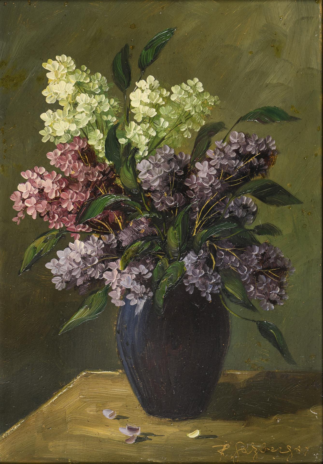 White and lilac lilac in a blue vase. Slight traces of age.
