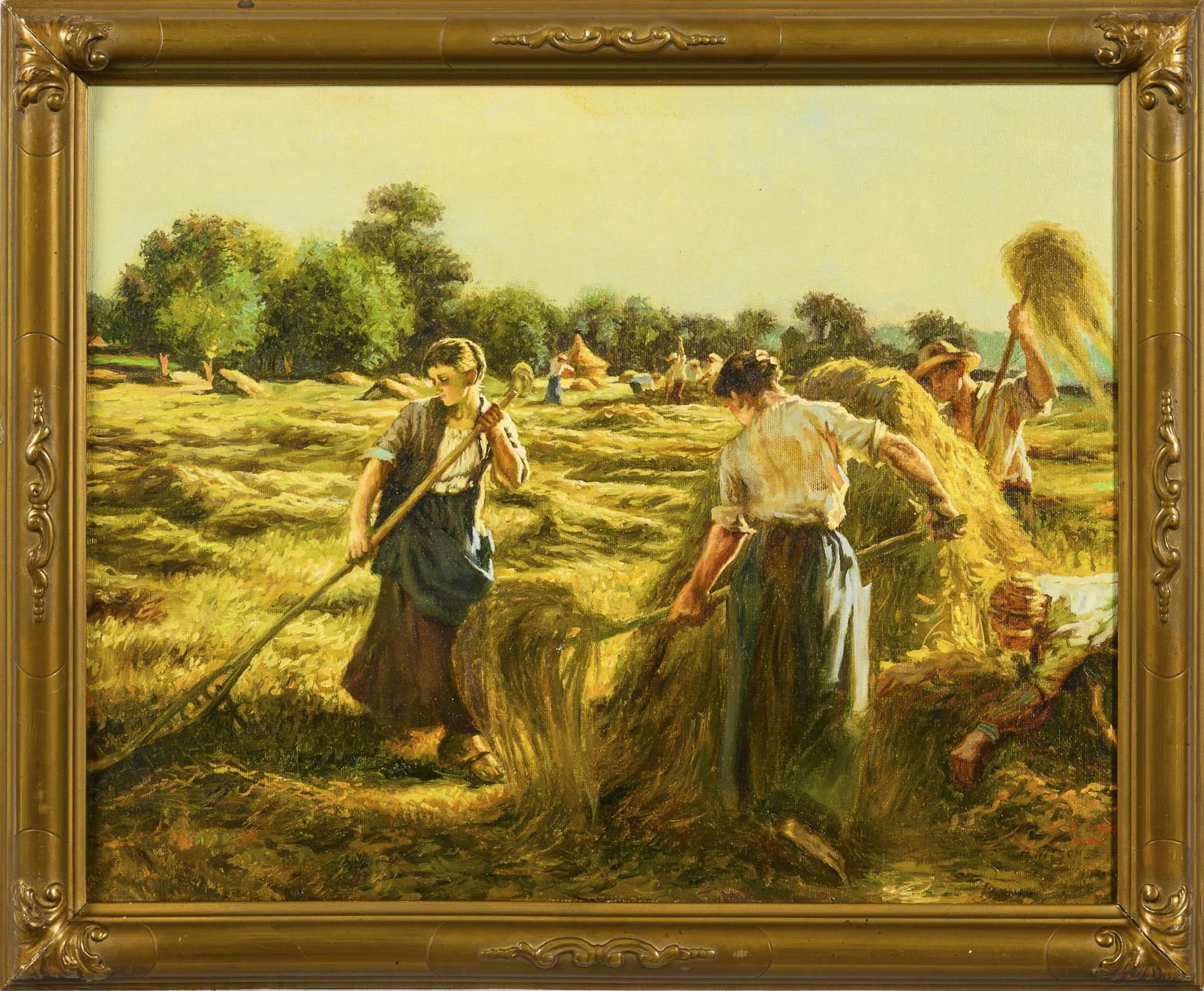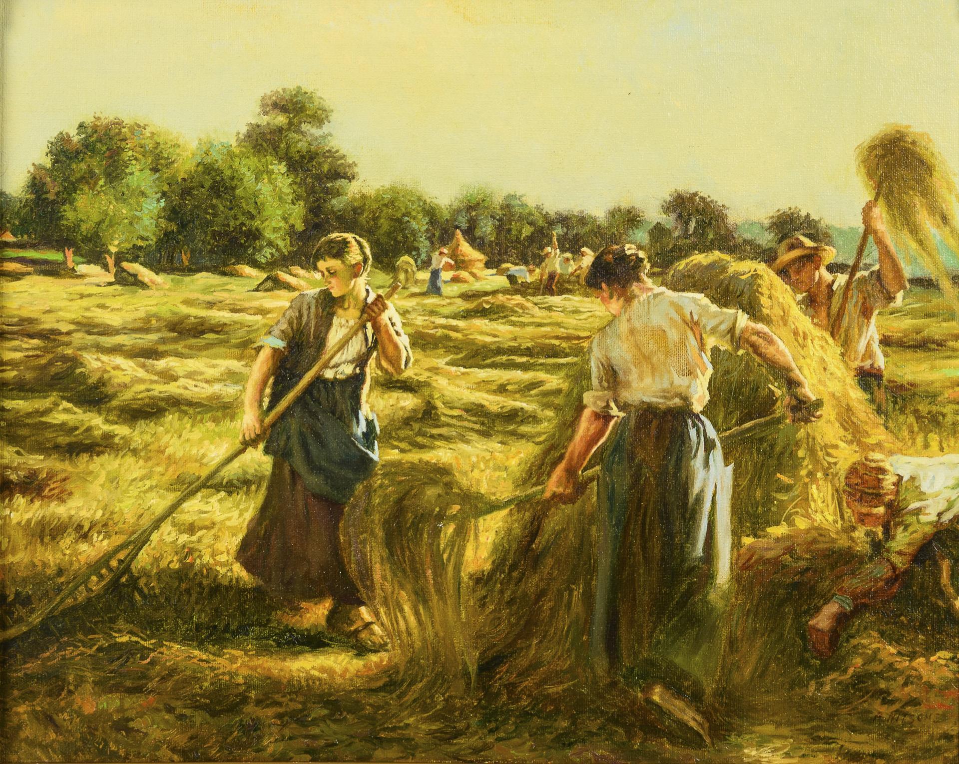 Peasants in the sunshine gathering hay in the fields. Doubled canvas.