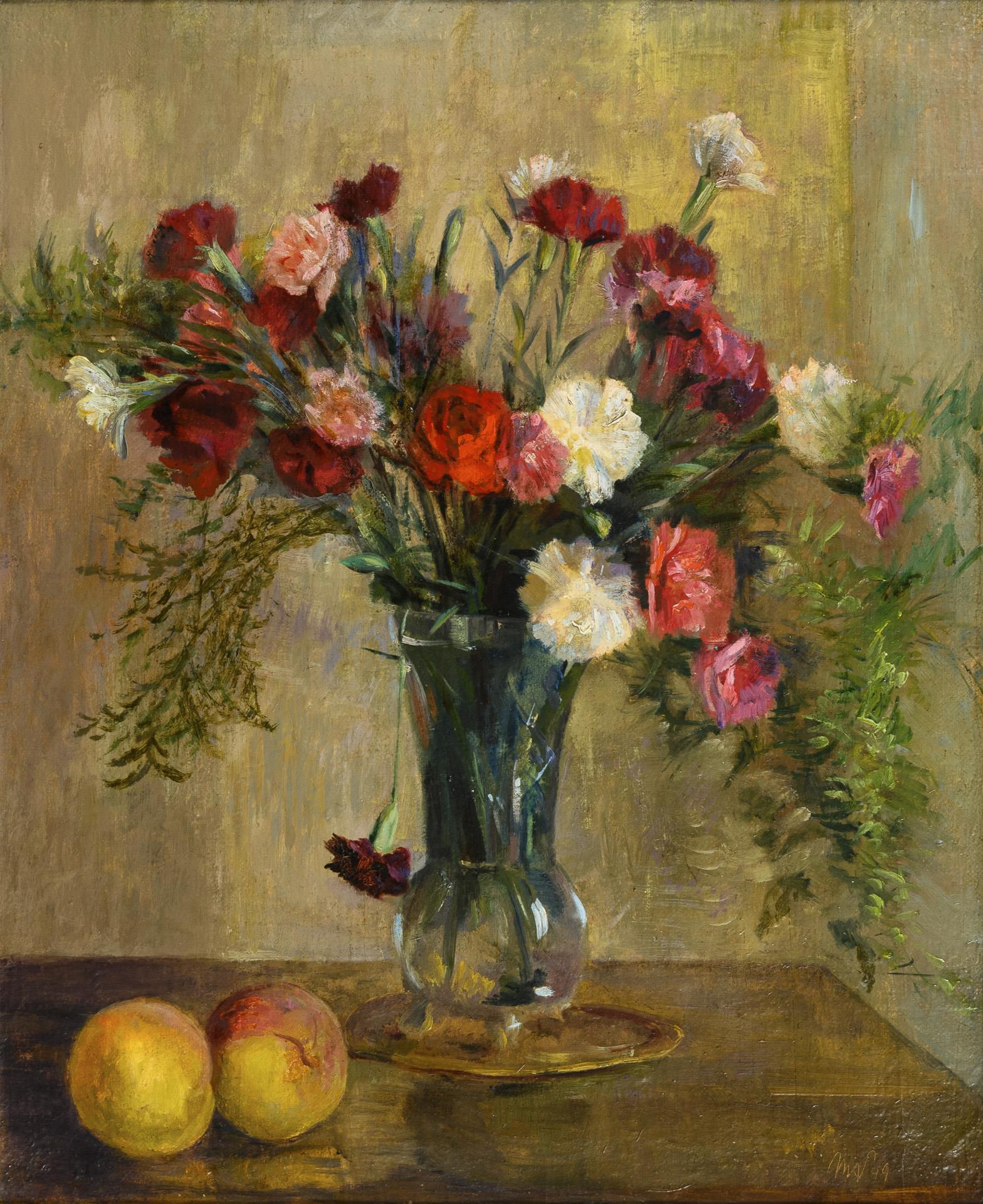 Indistinctly signed: Still life with carnations and peaches