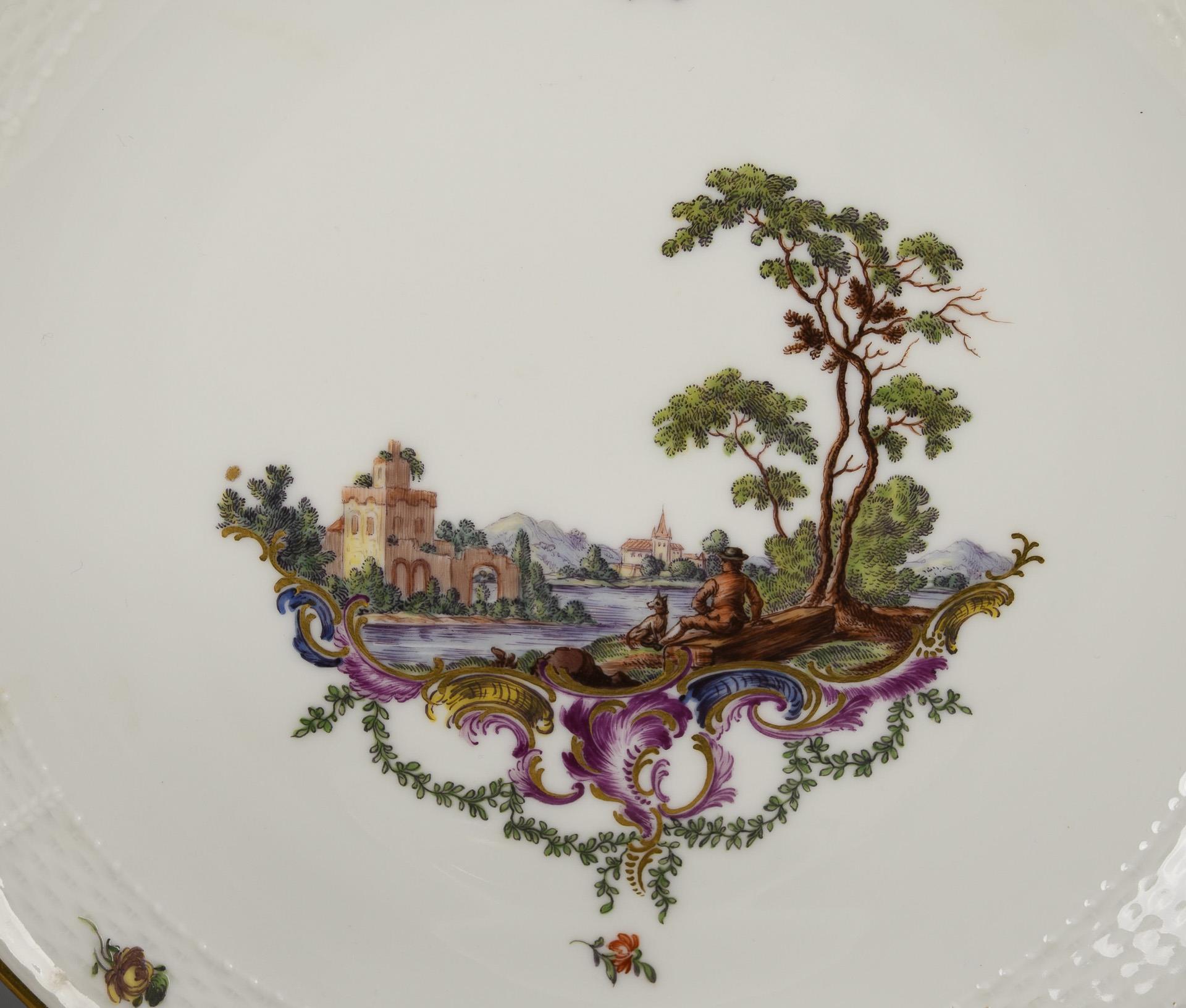 Form "Altozier". 6 coffee cups with 6 saucers, 6 teacups with 6 saucers, 6 cake plates, 1 plate with landscape painting (Ø 21 cm). 1 cake plate, 2 saucers with chipped rim, hairline crack in 1 coffee cup.