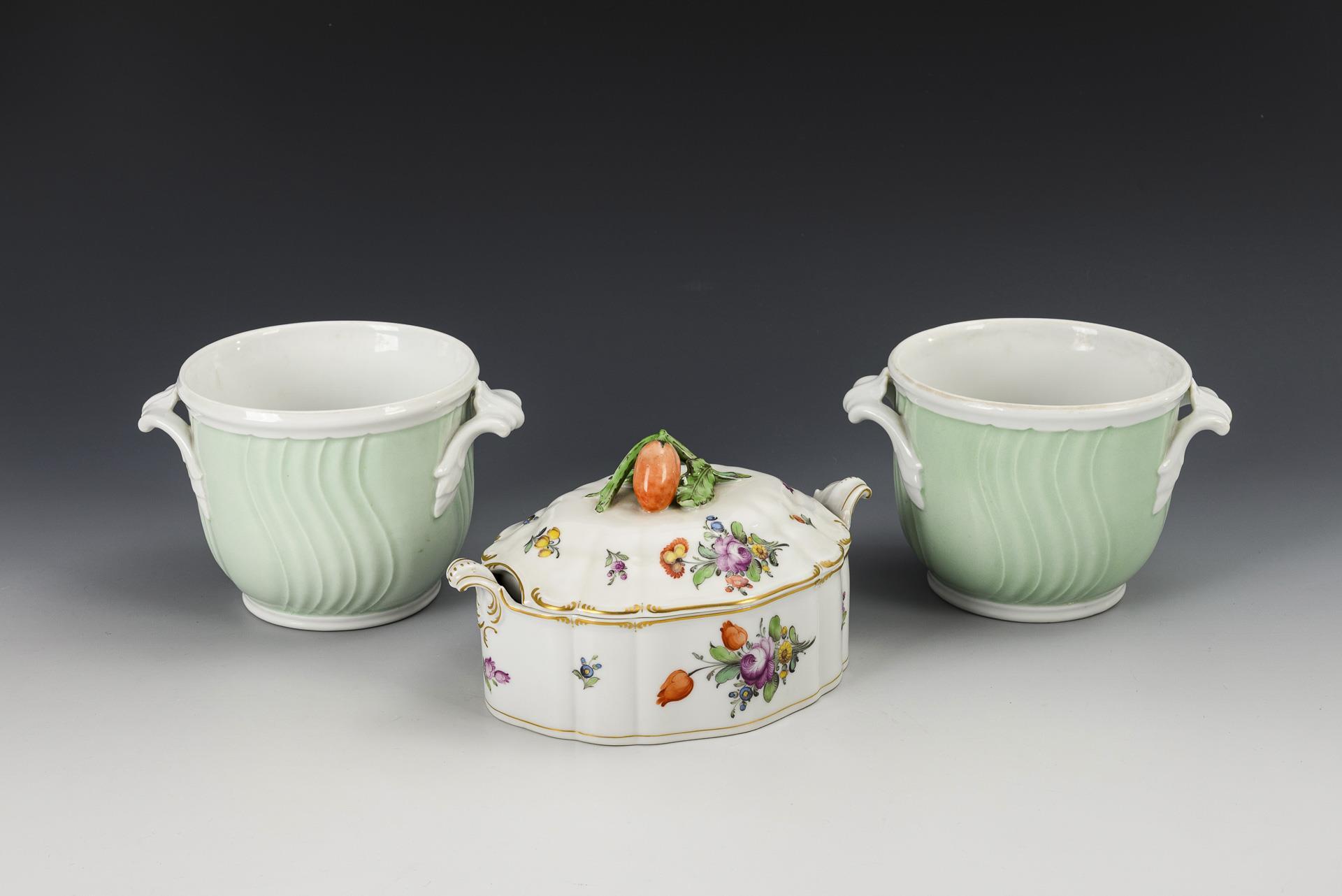 2 cachepots and tin with fruit knob. Nymphenburg.