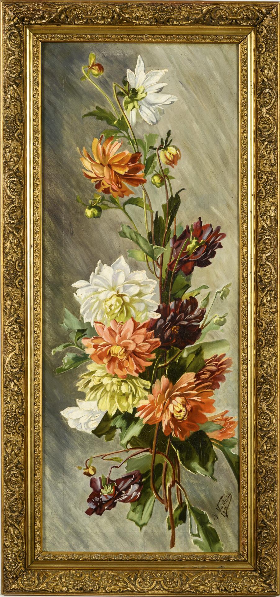 The flowers with dark red, white, yellow and orange blossoms against a neutral background. Minimal traces of age.