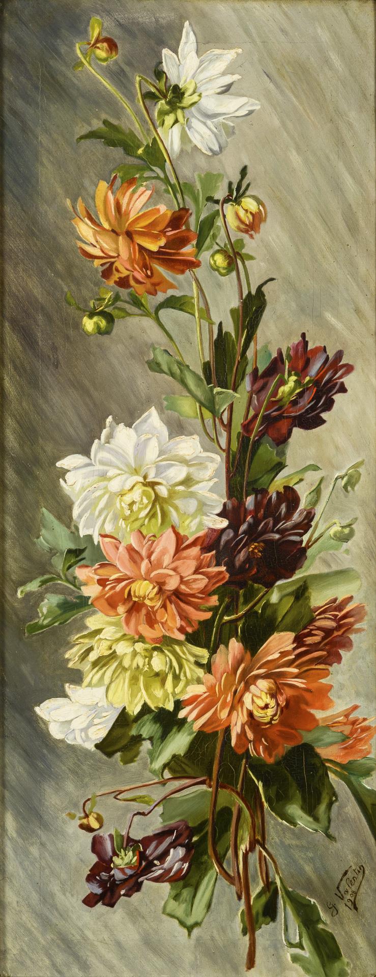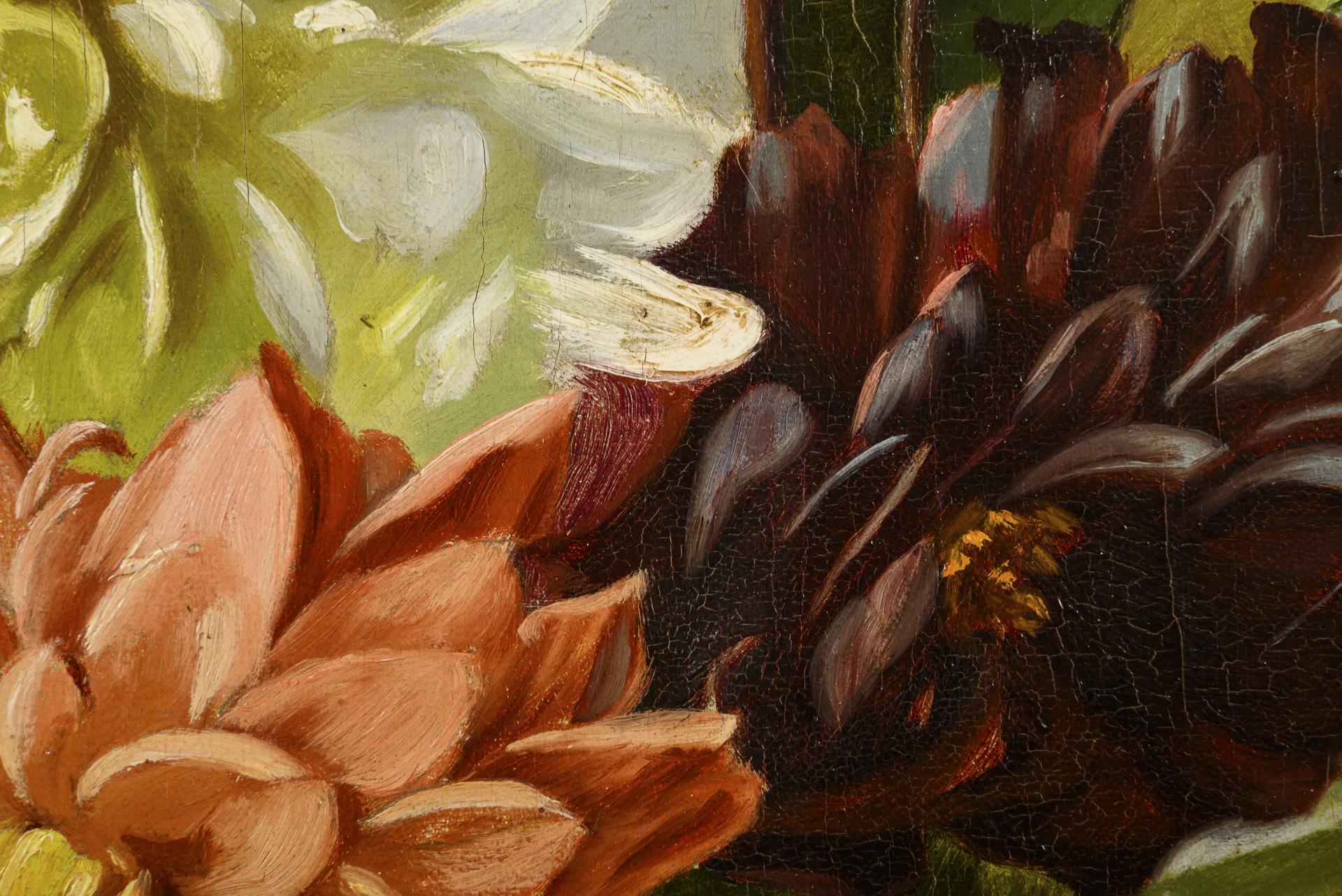The flowers with dark red, white, yellow and orange blossoms against a neutral background. Minimal traces of age.