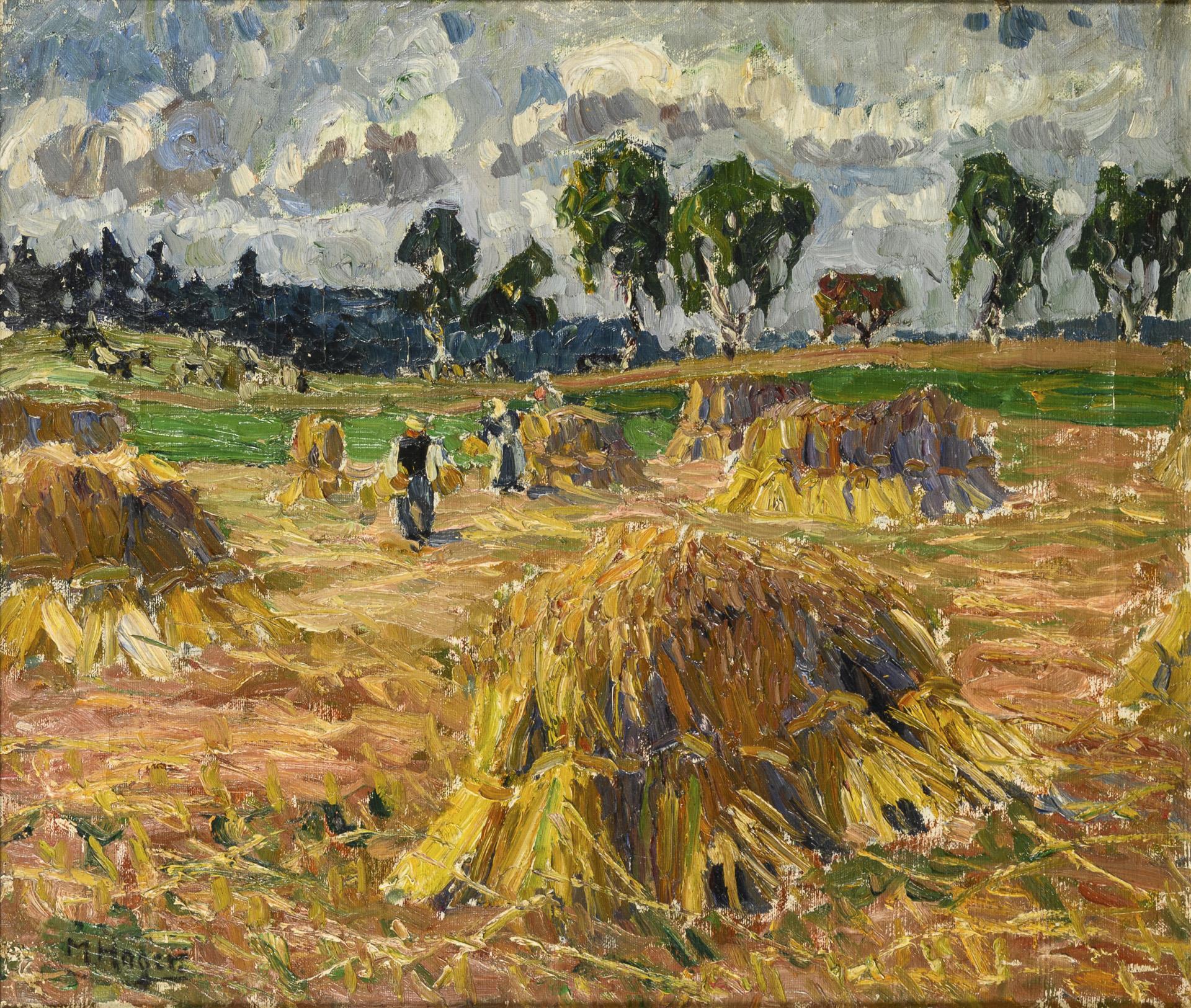 The peasants with the yellow corncocks in the field in a hilly landscape under a slightly cloudy sky.