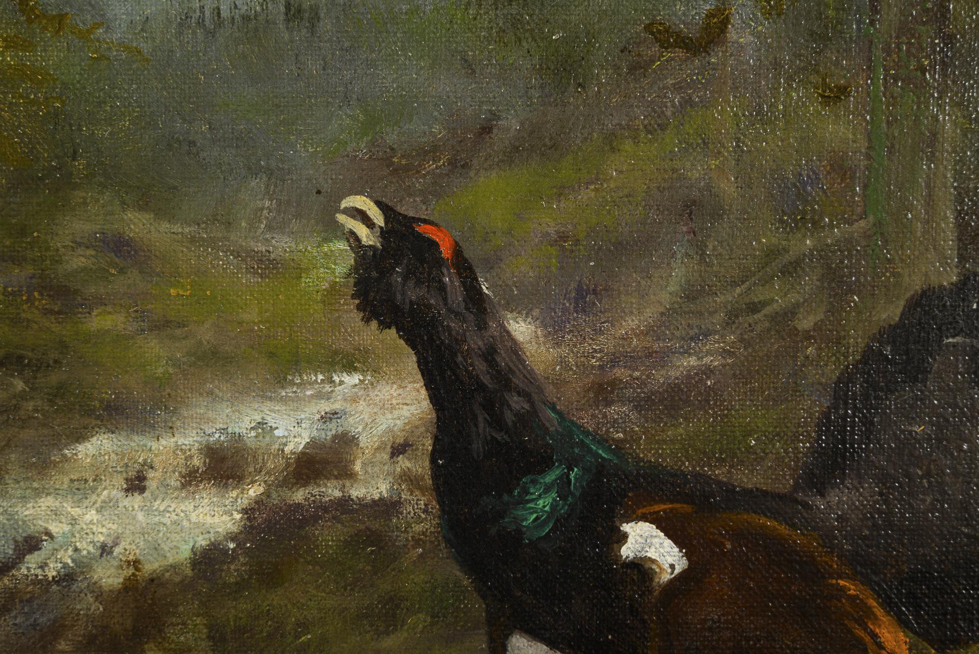 The crowing bird on a rock by a wild stream in the mountains. Minimal traces of age.