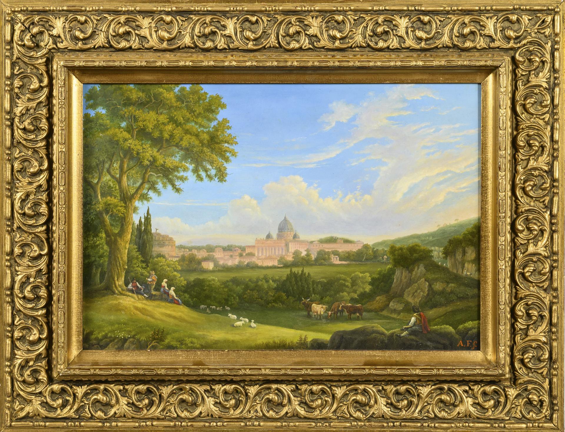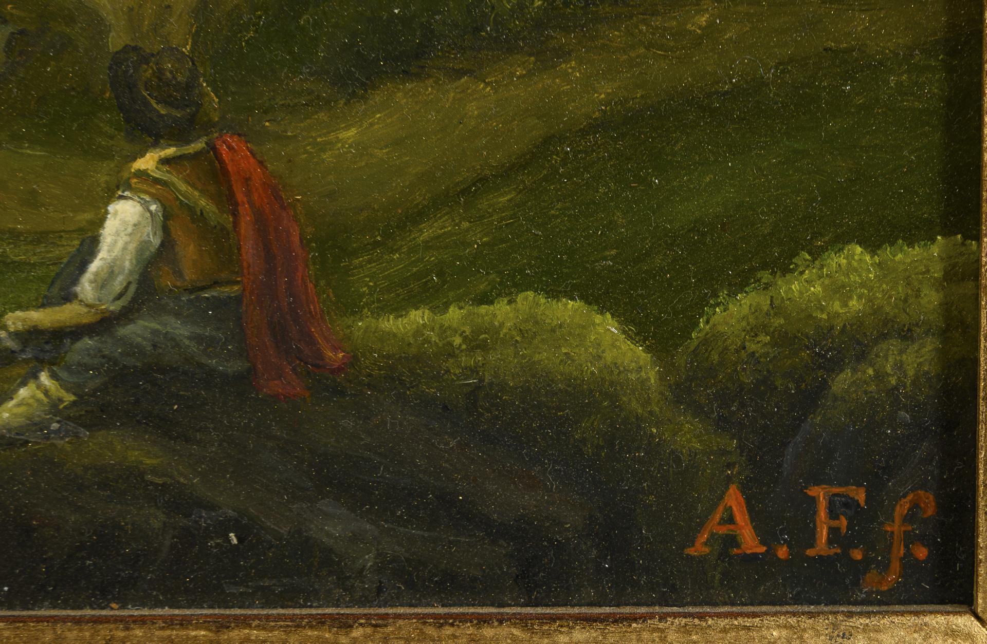 Oil/painting card. Monogrammed lower right with the addition "f[ecit]". Early 20th century