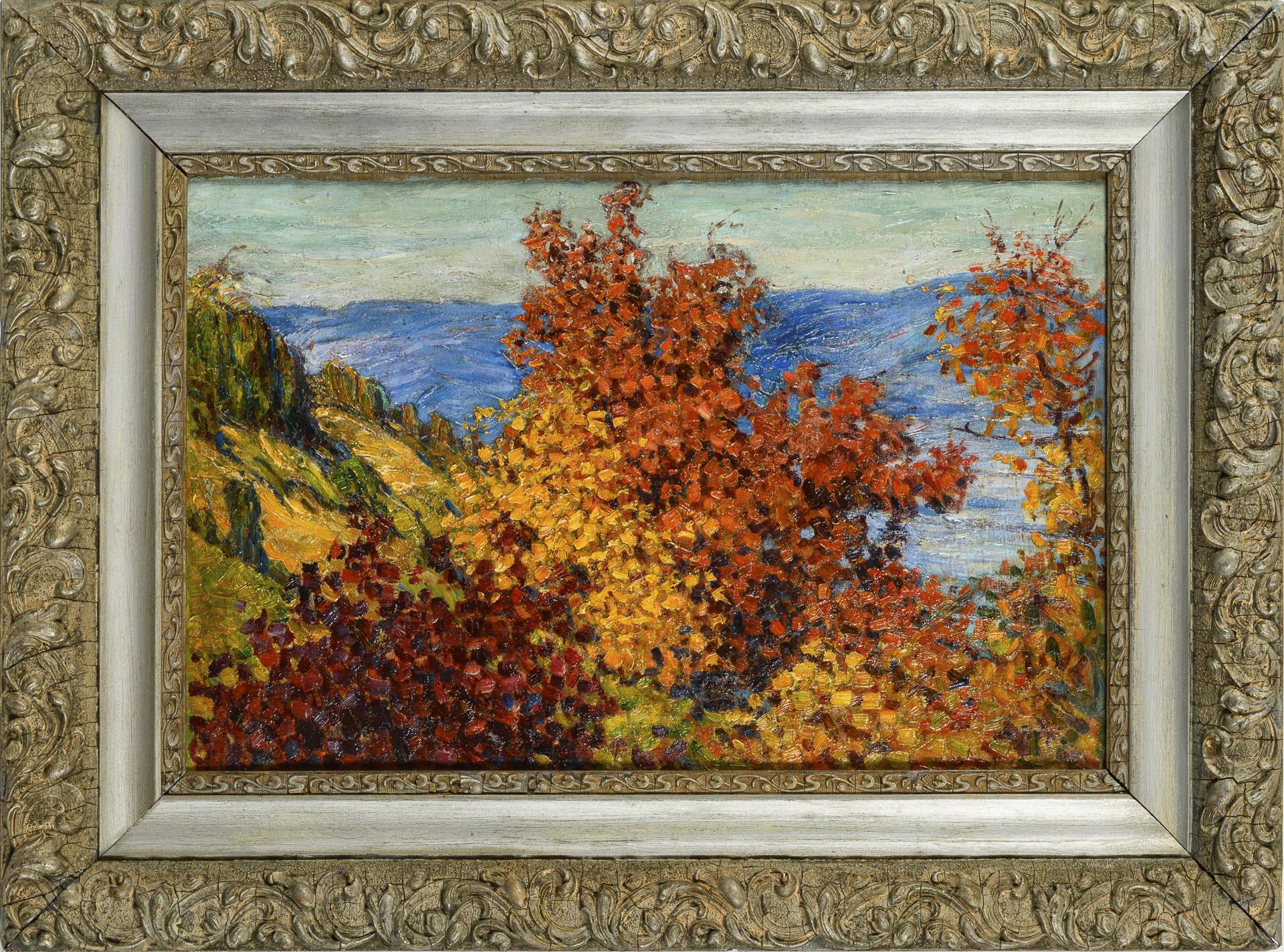 Autumnal woods painted in a pointillist style on a slope in front of the mountains.