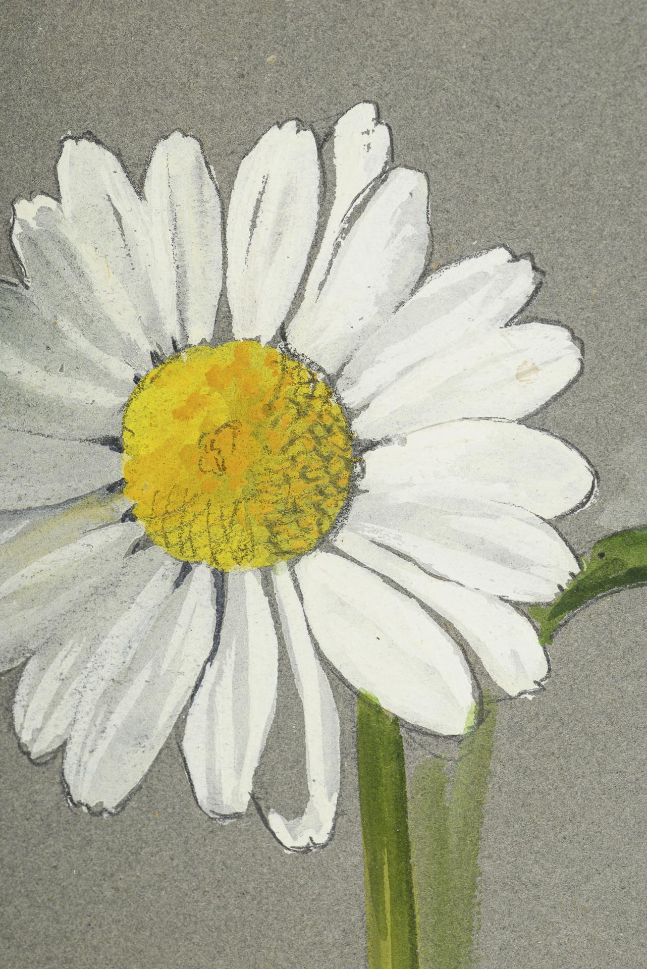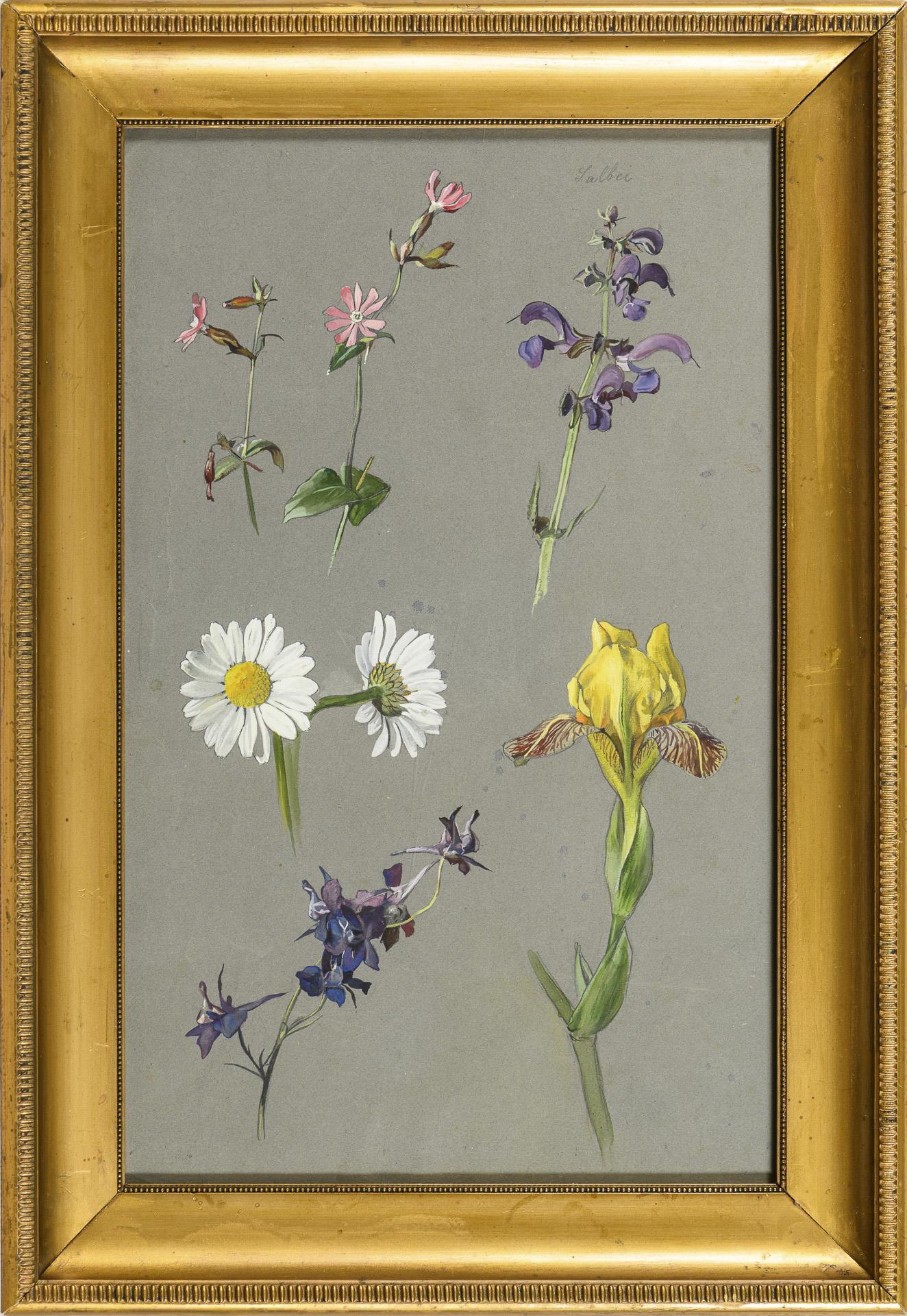 Various flowers such as margarites, sage or irises on paper. Slight creases.