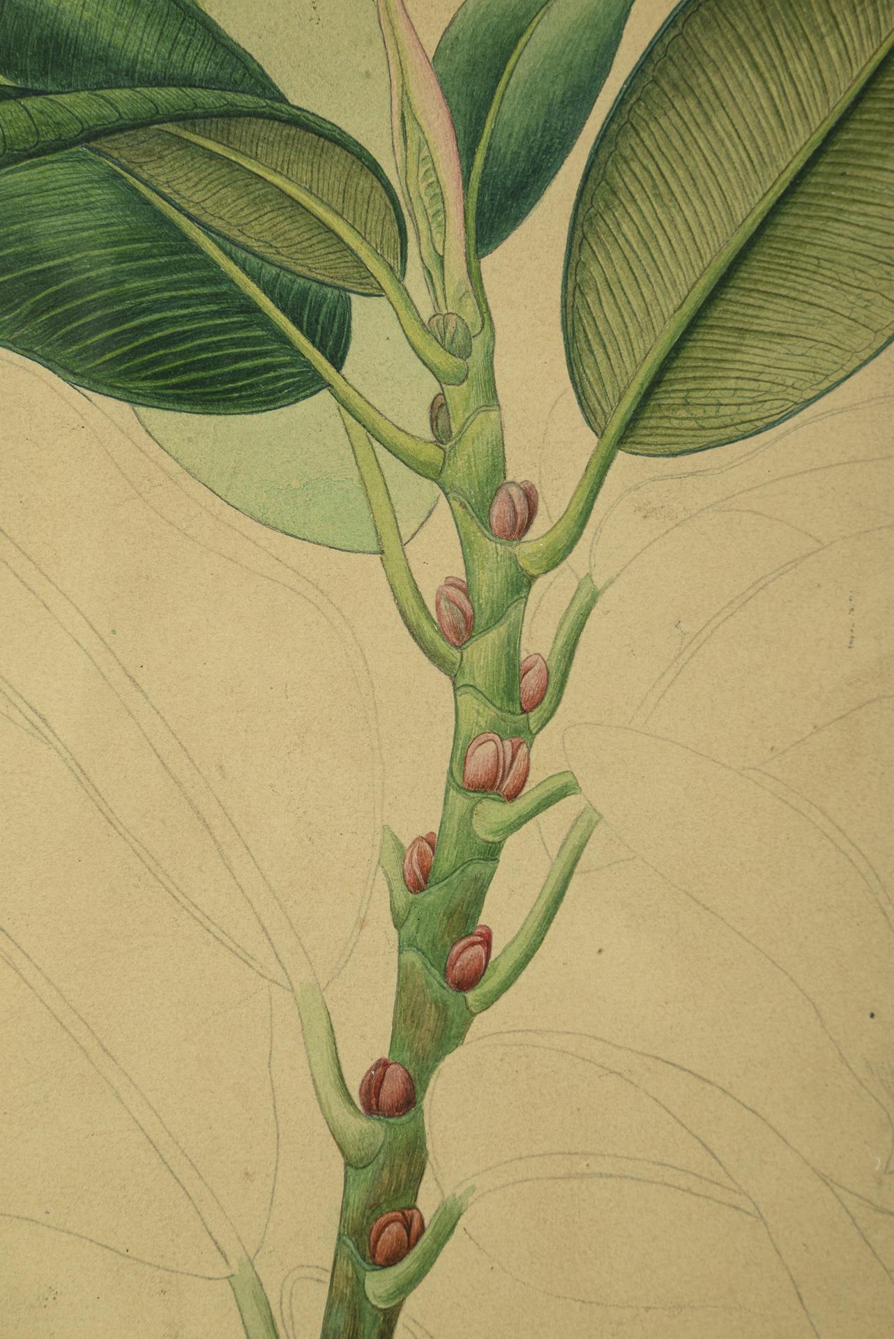 Partly colored plant study of the banyan fig. Slight creases in the corners.