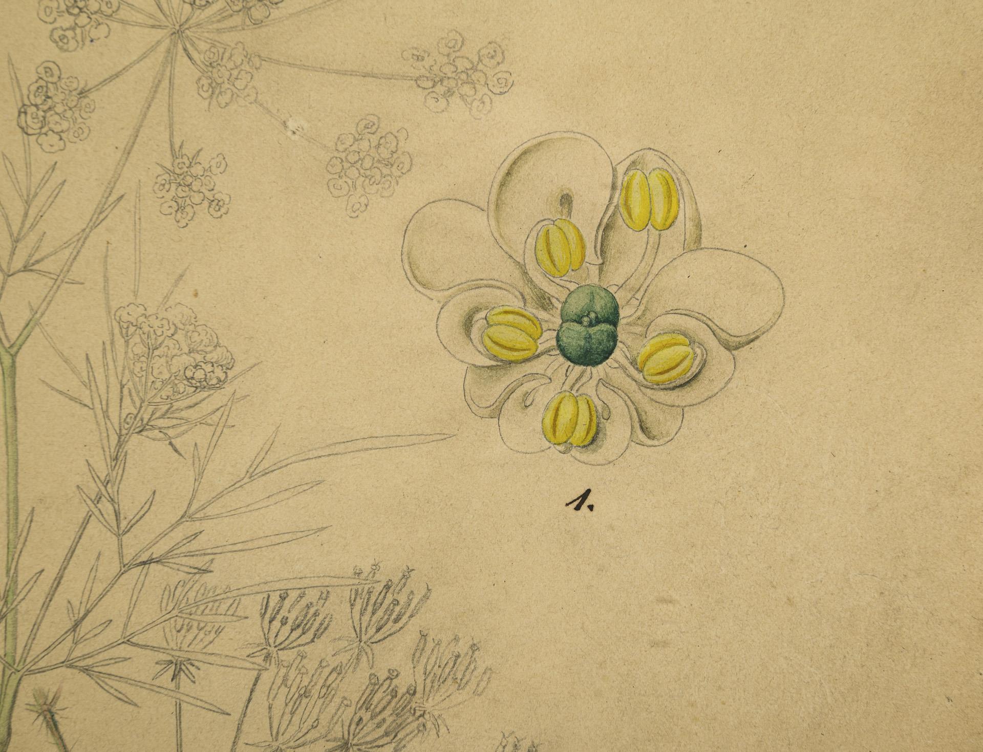 Partly colored plant study of the bulbous calf crop. Slight water damage in one corner, slightly cracked in the margins.