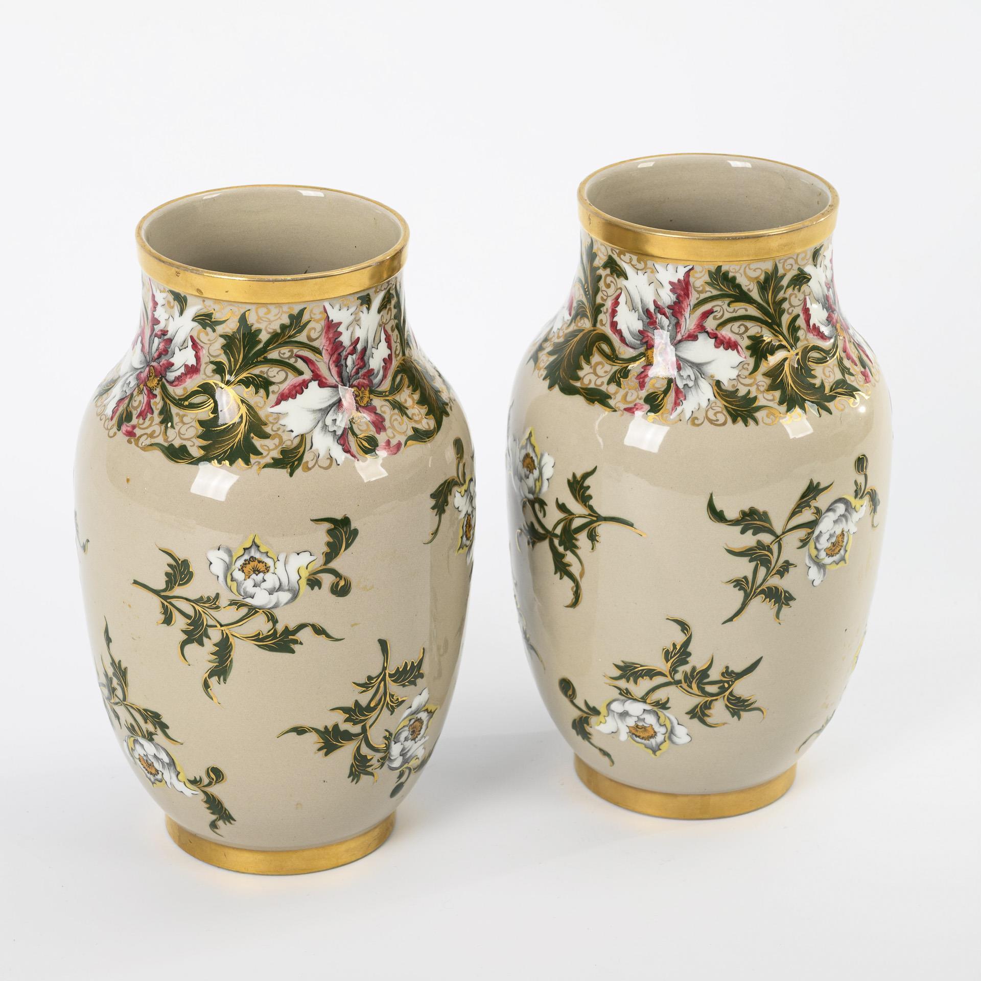 Pair of French Art Nouveau vases with fine flower painting. Keller & Guérin, Lunéville.