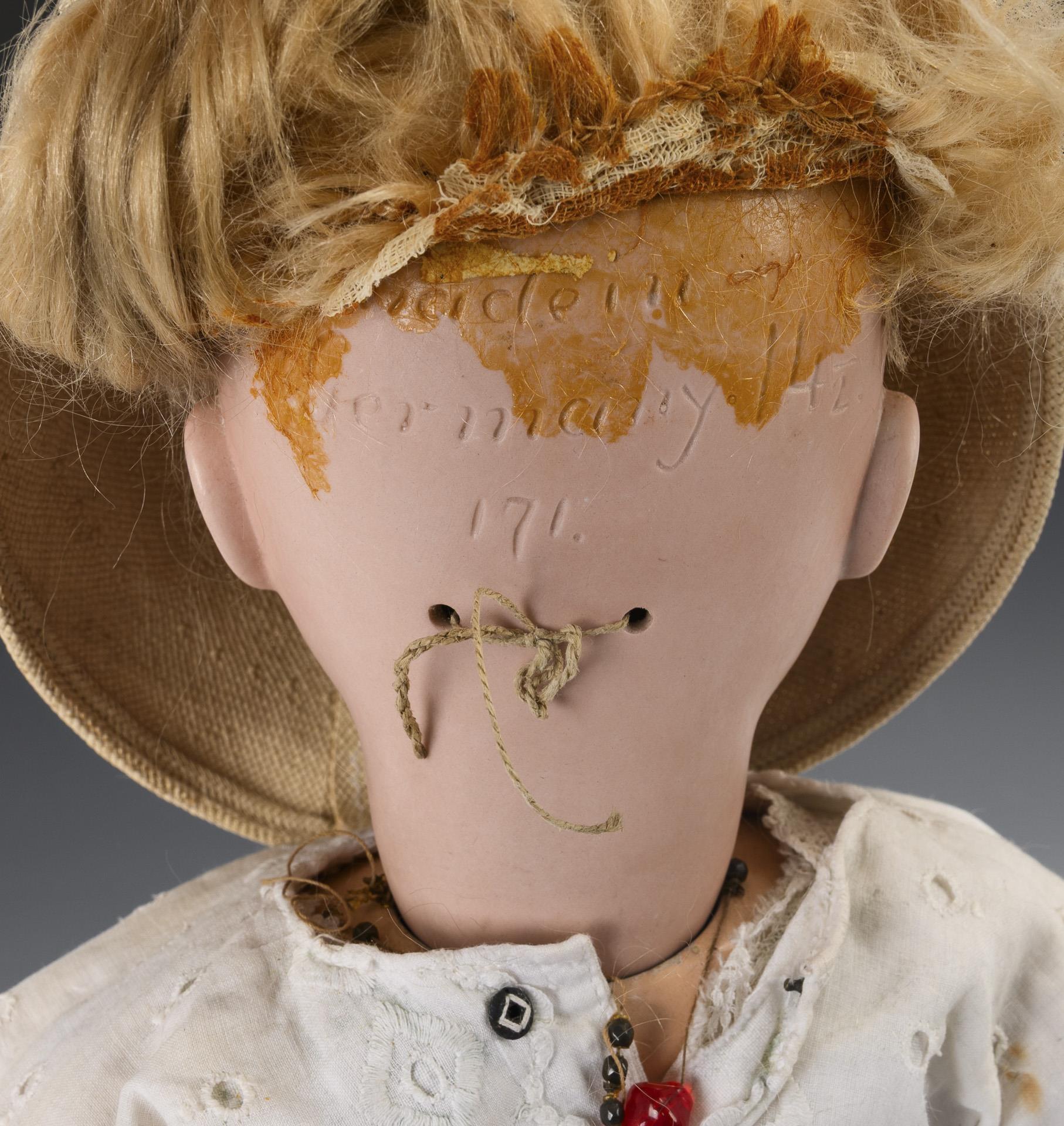 Cranked head, firmly plastered lid, brown glass eyes, defective blond mohair wig. 17-part jointed body. White dress, hat with floral decoration, cream-colored oilcloth shoes. Head not x-rayed: no defects visible. Body partly painted over, little finger on the left repaired.
