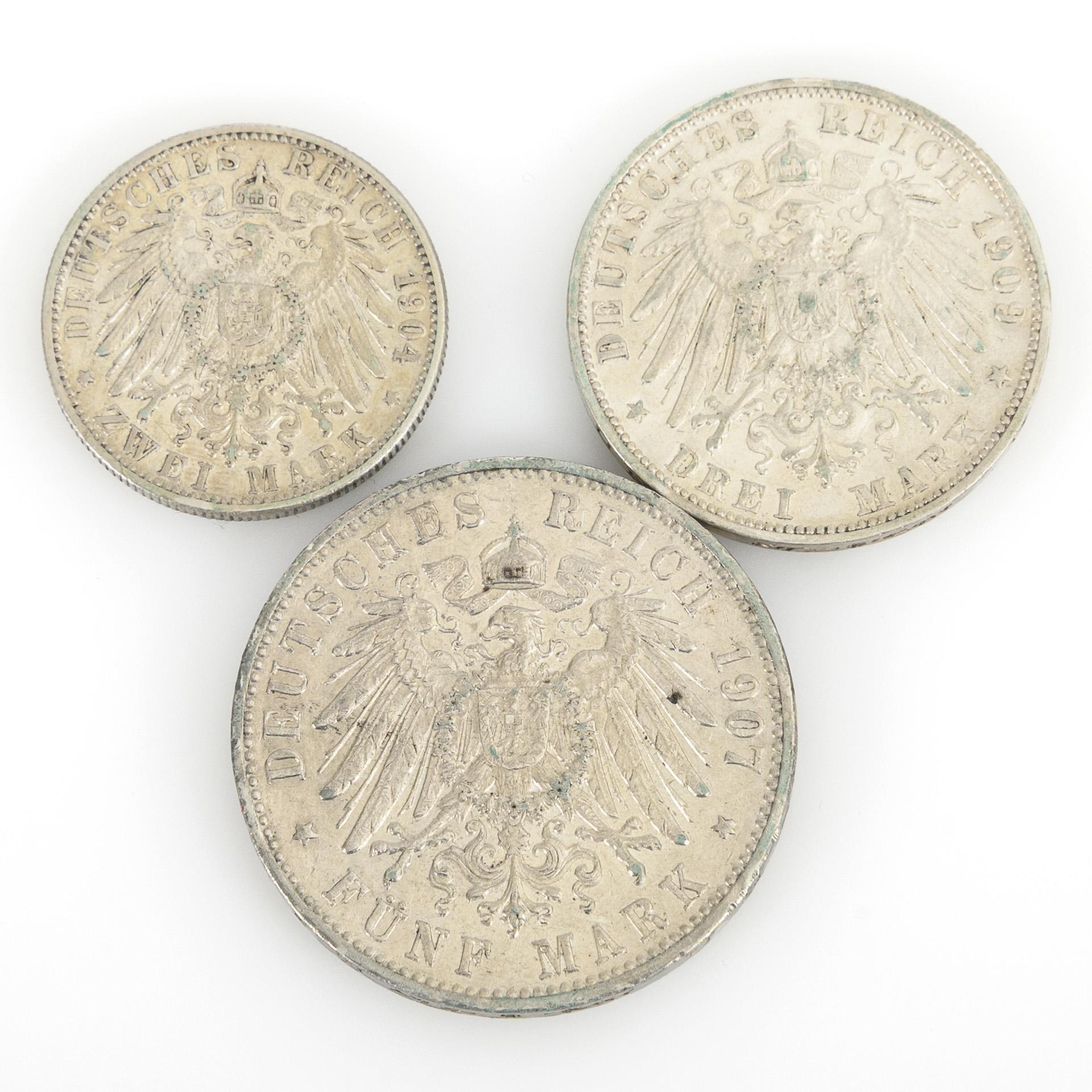"Wilhelm II King of Wuerttemberg": 5 marks from 1907; 3 marks from 1909; 2 marks from 1904. All mintmark F. Condition: very fine.