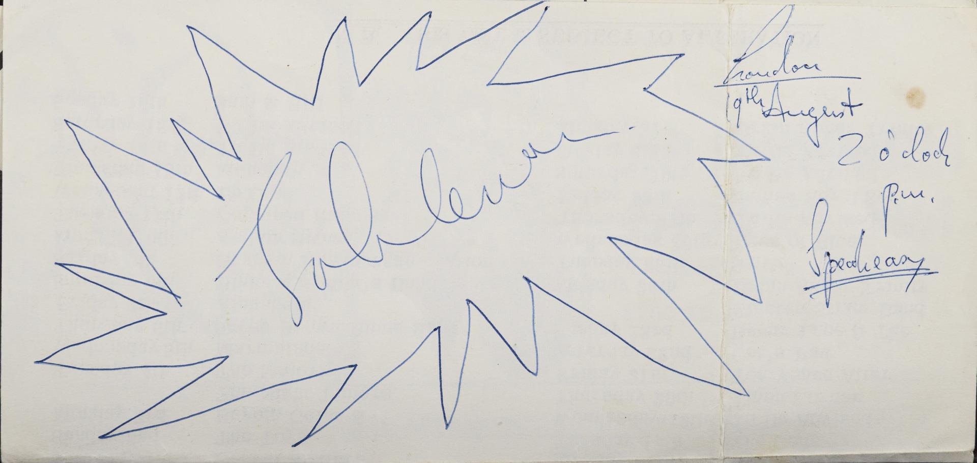 On the reverse of the folded program sheet of the legendary "Speakeasy" club from July 1967 is a short dialogue between Lennon and 'Sascha', as well as the autograph with date "London 19th August 2 o clock p.m. Speakeasy".