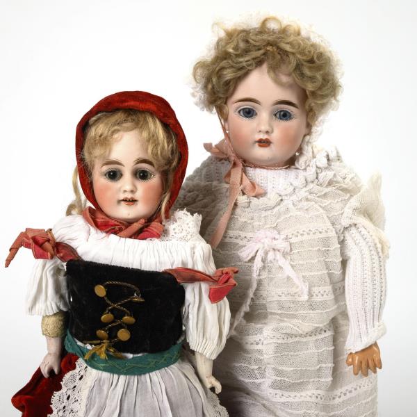 Both with chest head, sleeping eyes, blond mohair wig and leather body. Kestner doll (head mark 147) with blue eyes, curly wig and jointed arms, dressed as a baby in white, l 41 cm. / Small Baehr & Proeschild doll (head mark 309) with brown eyes and bisque forearms, dressed as Little Red Riding Hood in traditional costume with red velvet cap, l 30 cm. Wig and head cover fixed, heads not x-rayed: no visible defects.