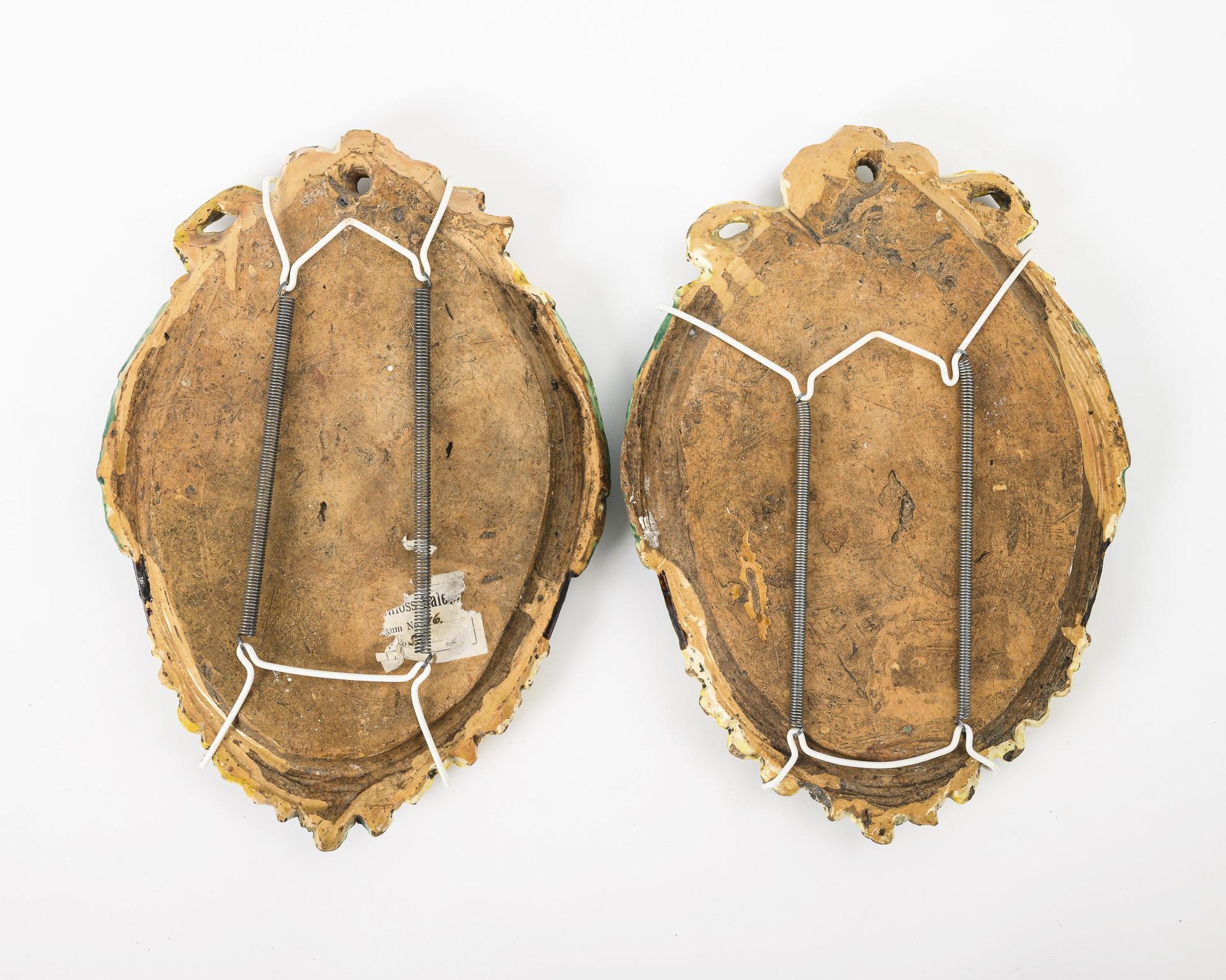 Oval relief panels with partially sculptural depictions of Christ and the Virgin Mary and a ribbon finial with angels. Replaced wall mountings. Signs of age and wear, with defects.