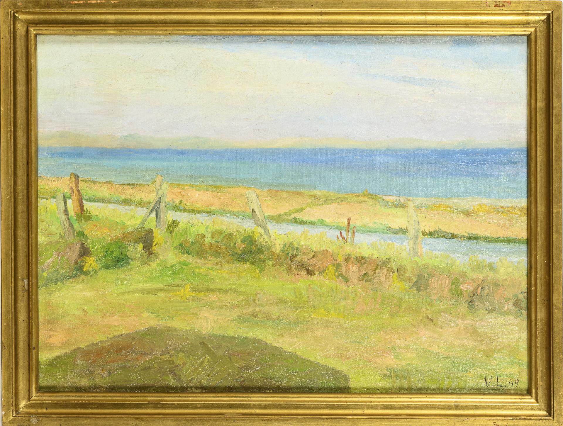 View from the greenish-yellow meadows out to the blue sea under a slightly overcast sky.