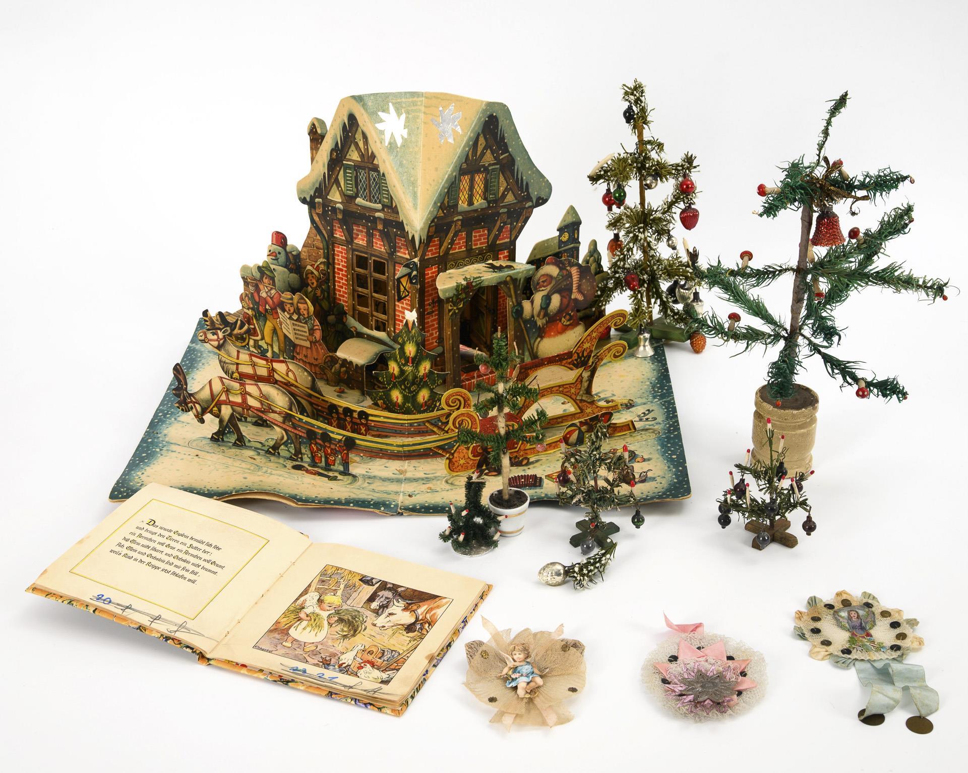 Scenery book by Vojtech Kubasta, Czechoslovakia: Santa Claus with moving eyes and mouth on the cover; pop-up book with reindeer sleigh, Santa Claus and family in front of the house, blank wish list on the back cover. / 6 Christmas trees of different sizes with hangings, book "Zwölf Englein hatten viel zu tun", numerous small Christmas tree decorations, 4 rosettes made of fabric or paper, 2x with wafers. Book shows strong signs of age/use, rest mostly some signs of age/use.
