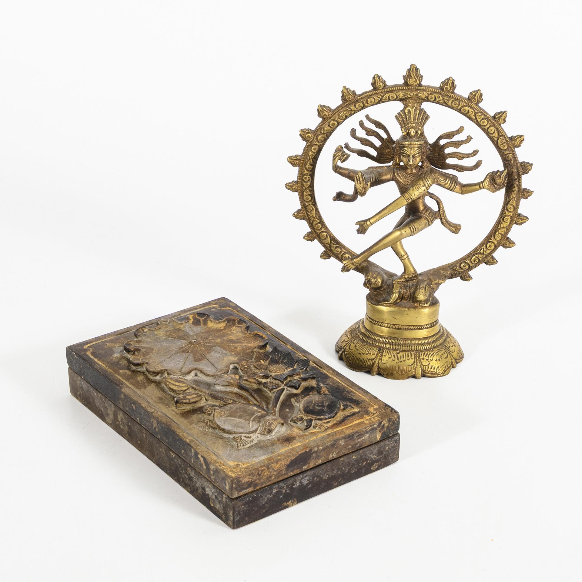 Bronze figure on a multi-pass base, dancing in a wreath of flames. H 19.5 cm. / Comes with soapstone rubbing stone for ink with lid. Lower part discreetly ornamented, lid with lotus blossom and turtles in relief. 3.5 x 18 x 11.5 cm.