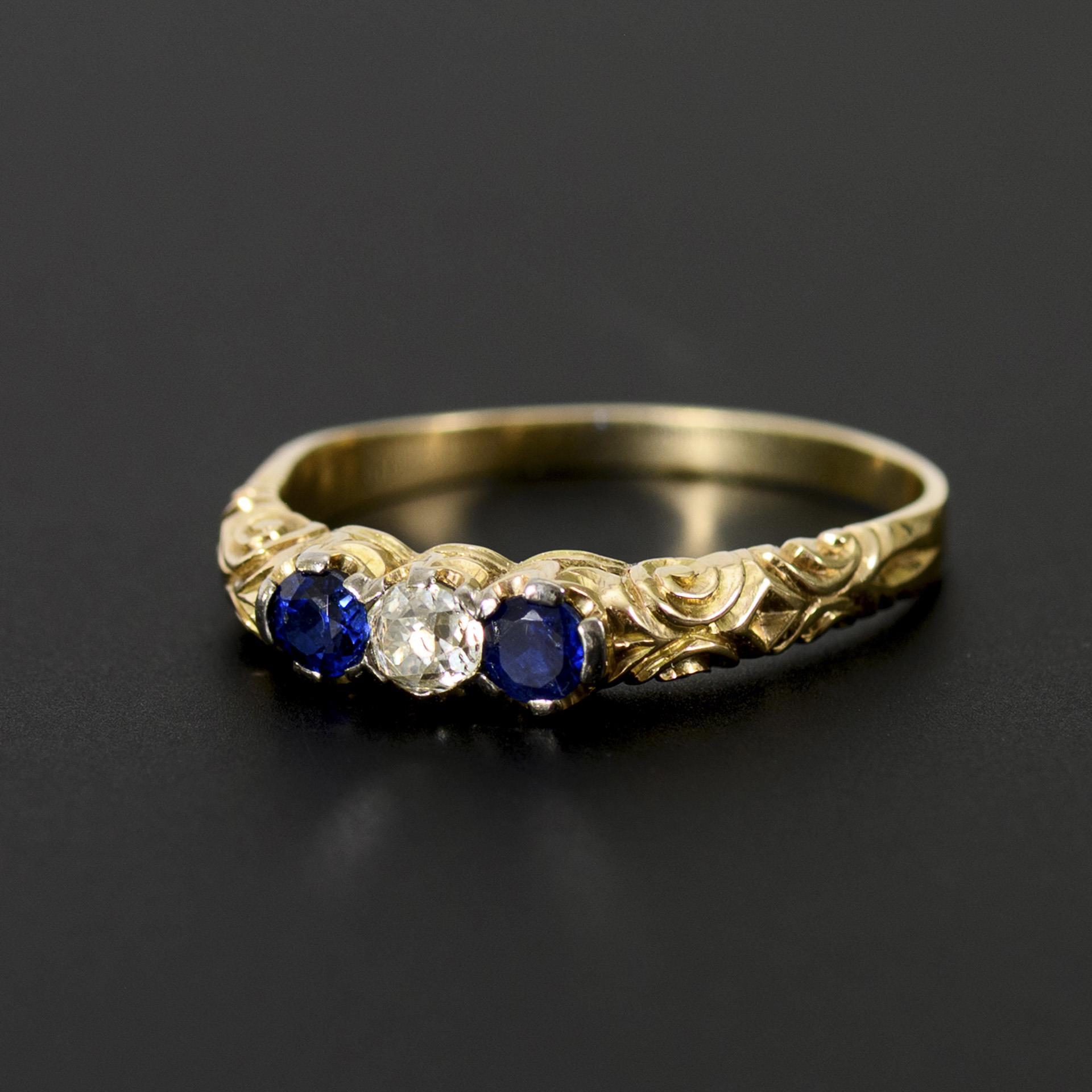 Ring, probably last quarter of the 19th century, set with an old-cut diamond, flanked by blue colored stones, probably sapphires. The ring shoulders elaborately decorated with a geometric, tendril-like pattern. Minimal chips to the blue colored stones (visible under tenfold magnification), earlier extension of the ring band visible on the underside.
