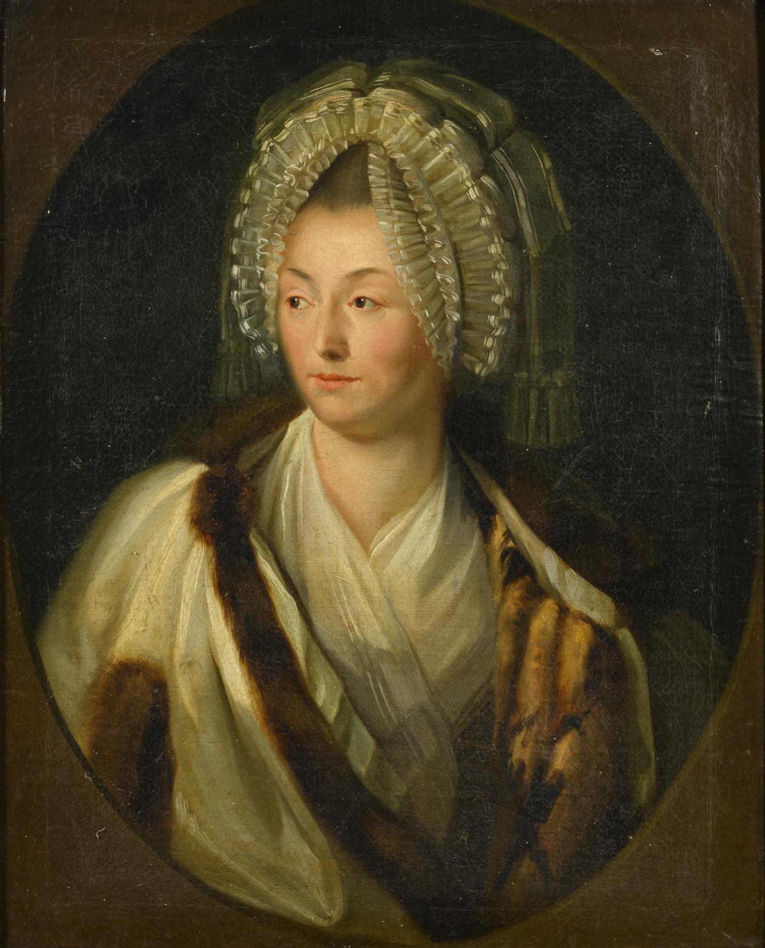 Portrait of a young woman in a fur-trimmed white coat in an oval painted passe-partout. Canvas relined.