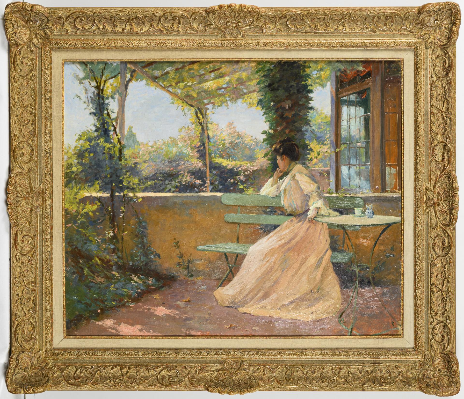 Young woman in a light-colored dress on a bench in the shade of the pergola on a sunny day. Two very small restored areas with adhesive backing.