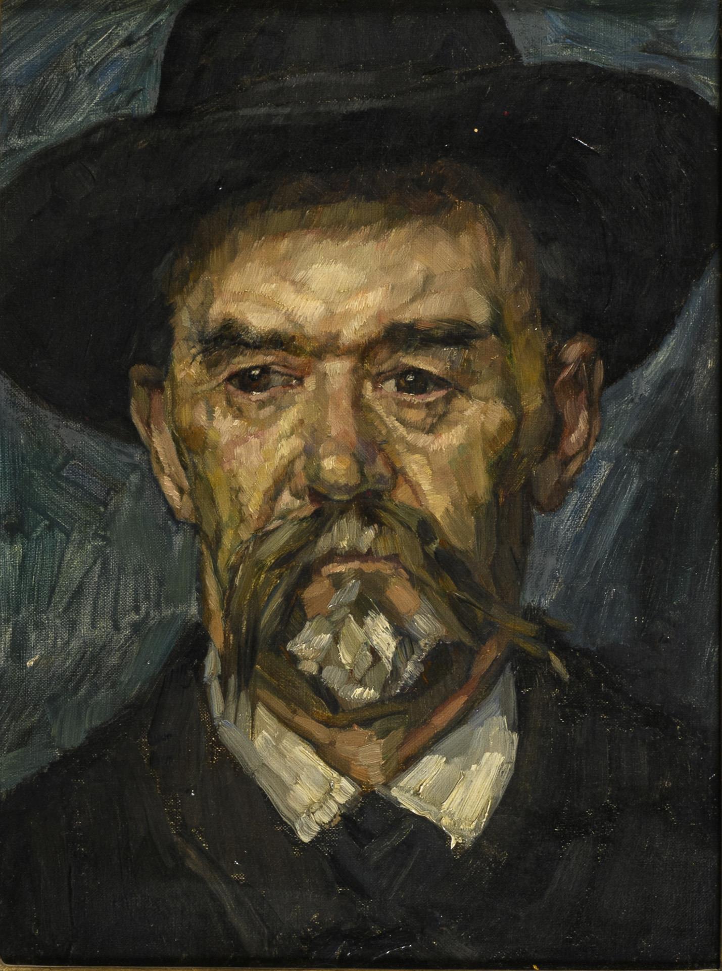 Portrait of an elderly man with a black hat against a blue background. Traces of age.