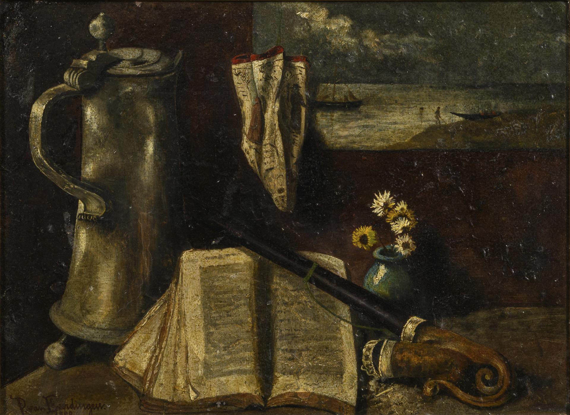 The pipe next to an open book, a large pewter jug and a small bouquet of flowers in front of a maritime painting. Traces of age.