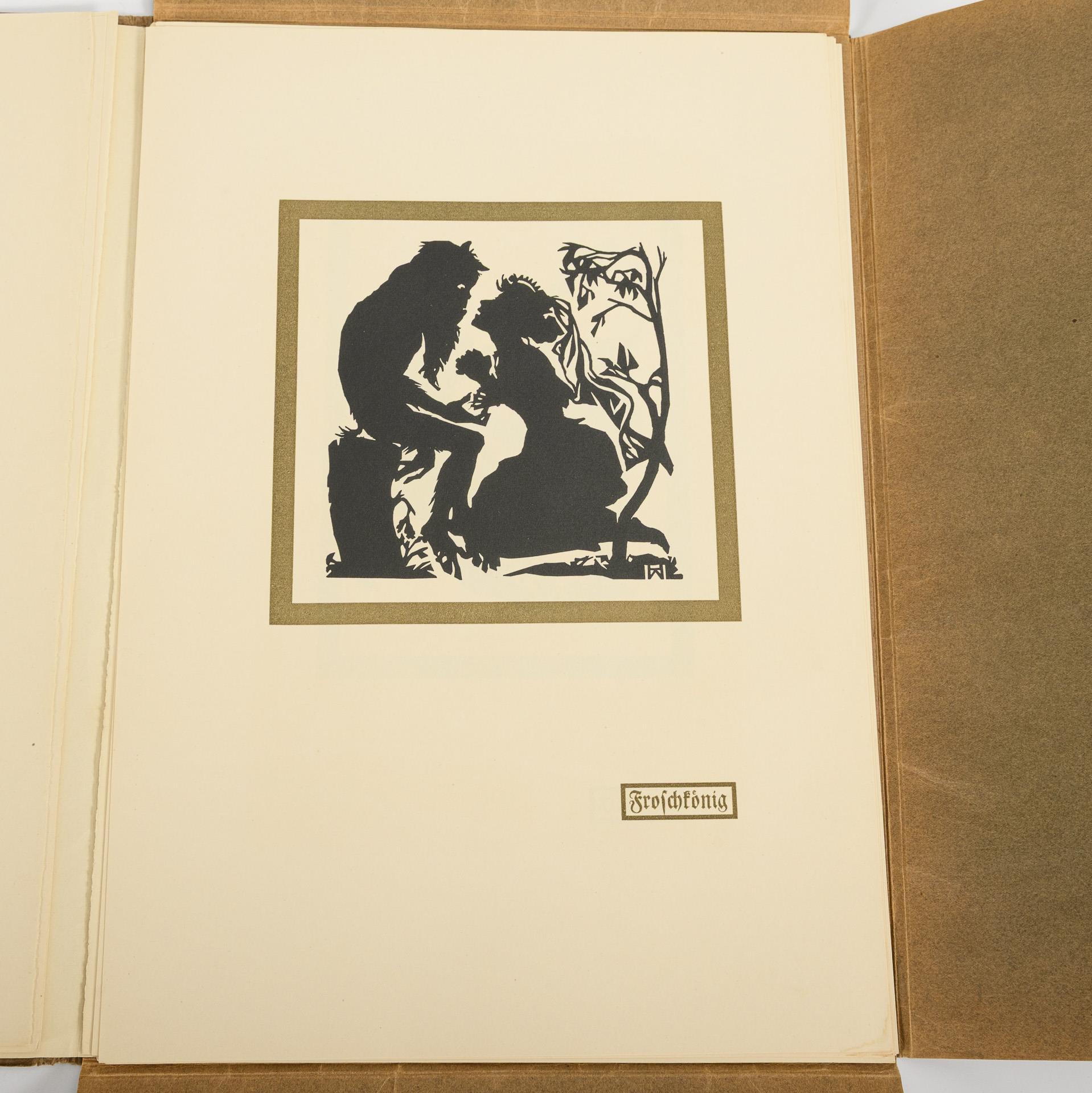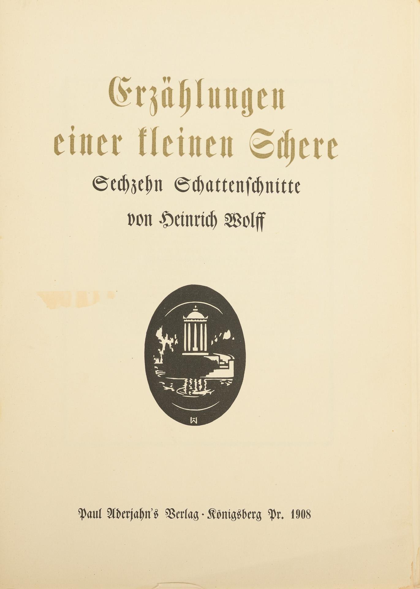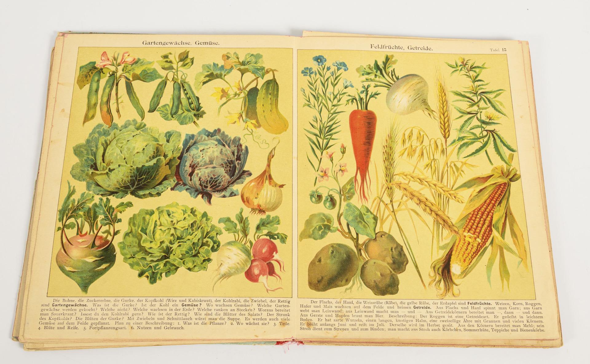 Double-page color lithographs with explanations and questions to stimulate storytelling. All identical in half cloth binding; pages and binding partly loose, occasional children's scribbles. In addition: Wolff, Heinrich "Erzählungen einer kleinen Schere - Schattenschnitt", Paul Aderjahn's Verlag. Königsberg. 1908. 14 of 16 sheets, in folder. 37 x 26 cm.