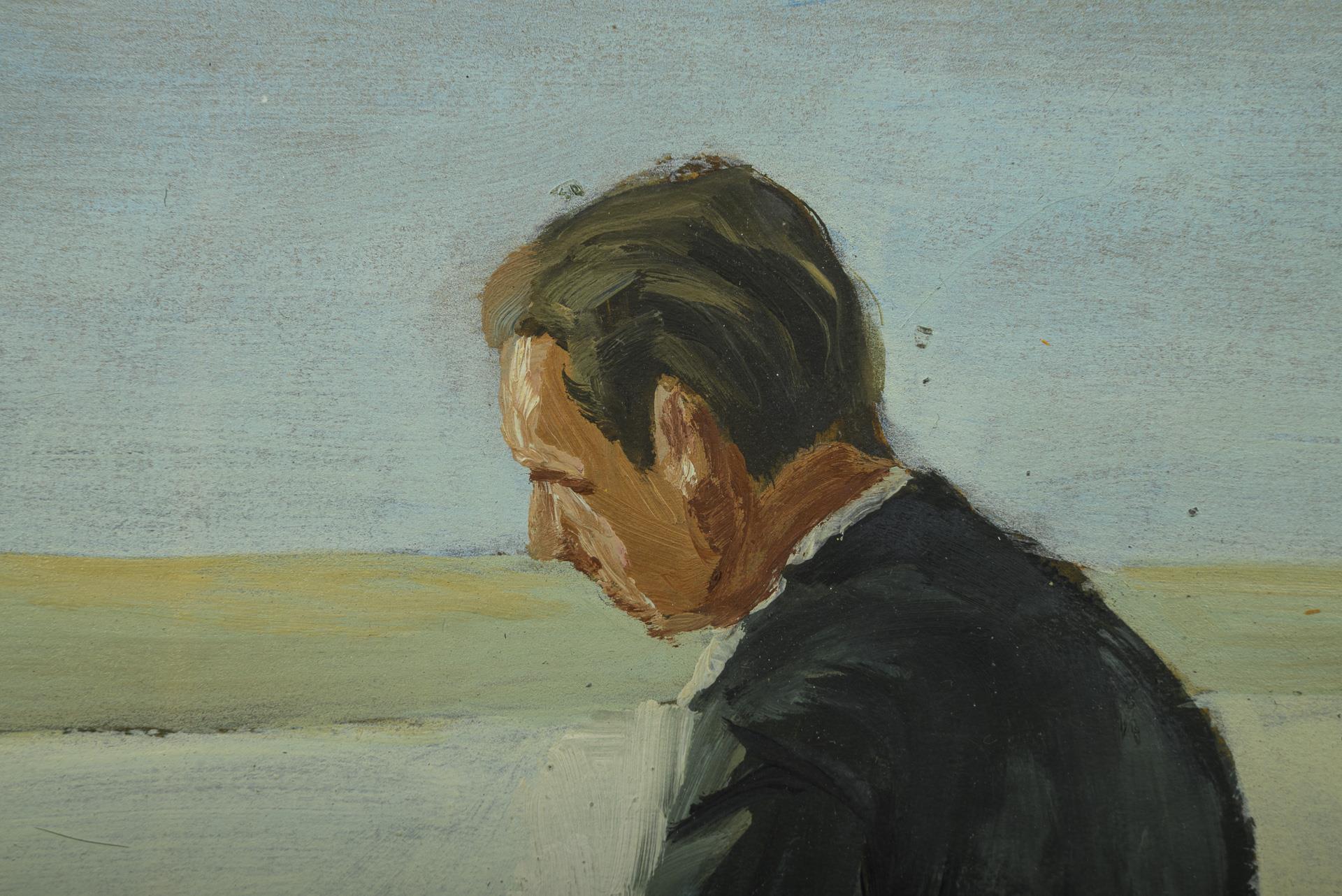 Three men, the rear one of whom could be the artist himself, in the sunshine on the meadow slope above the shore. Minimal traces of age.