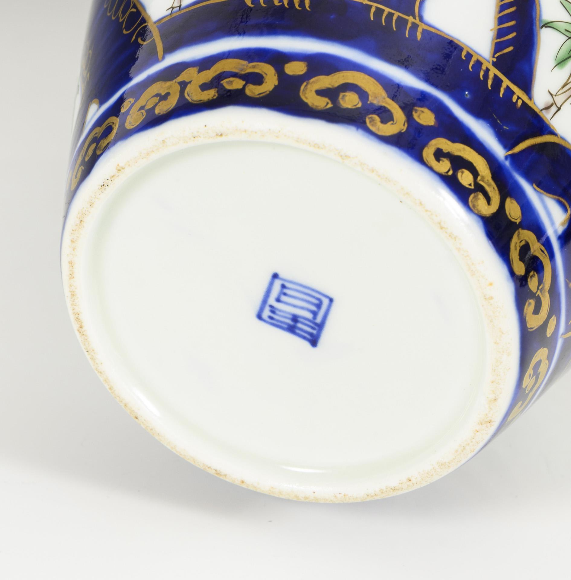 Baluster vase with three stylized blossom trees (cherry, pine and ?), complemented at the bottom by bamboo plants. Underglaze blue painting, supplemented with gold, green and red.