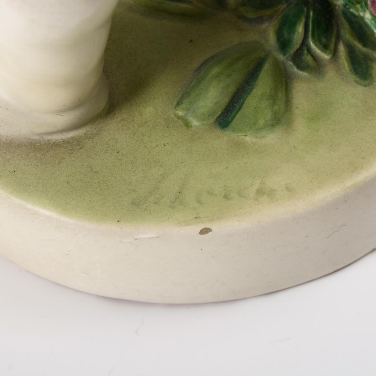 Stehender Putto mit Blumengirlande auf Rundsockel.